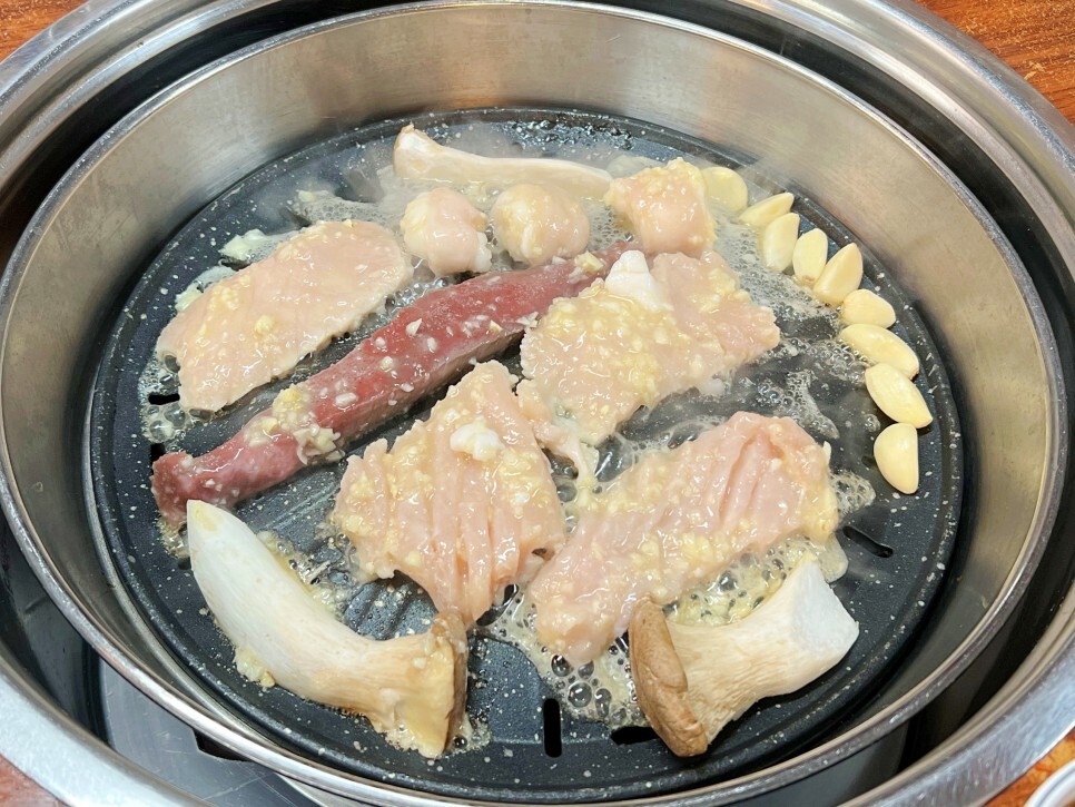 마늘 양념이 발라진 양곱창은 타지 않게 잘 굽는 게 포인트인데요. 붉은색의 염통은 특히 빨리 익으니까 먼저 구워서 맛보면 됩니다. 마늘과 버섯도 함께 구워줍니다. 양과 대창도 맛있게 익어가네요.