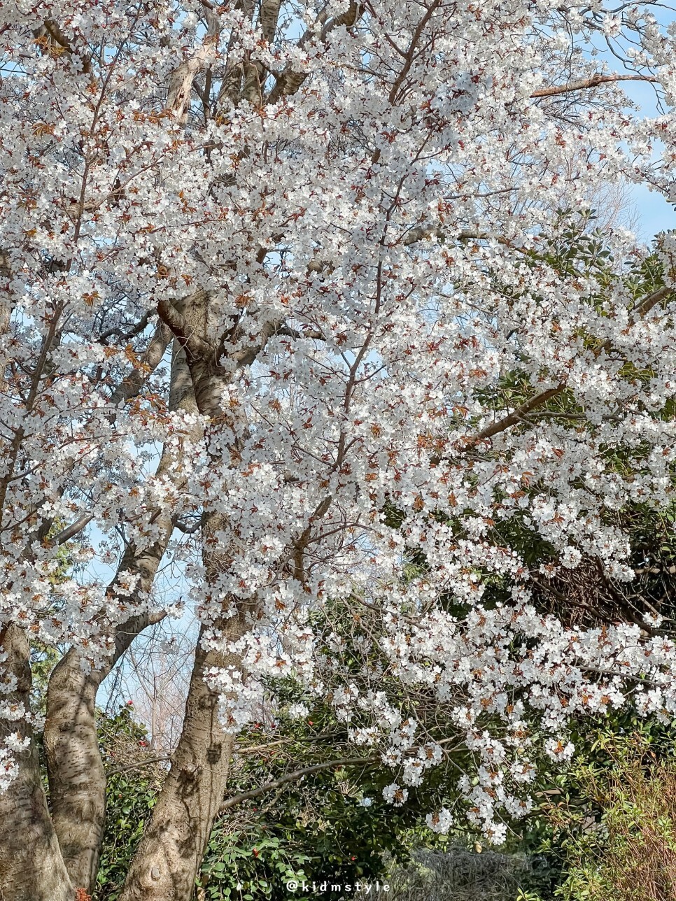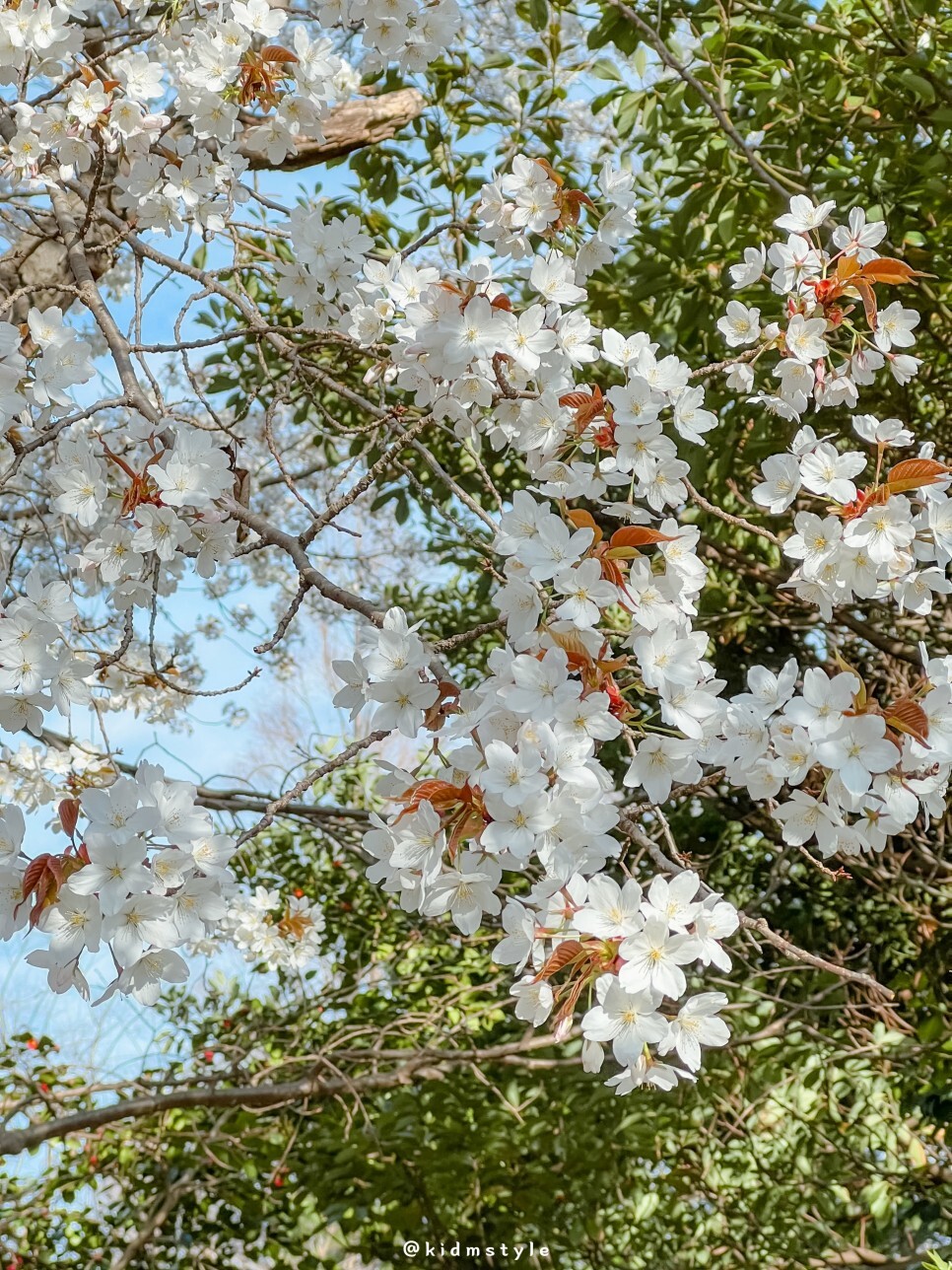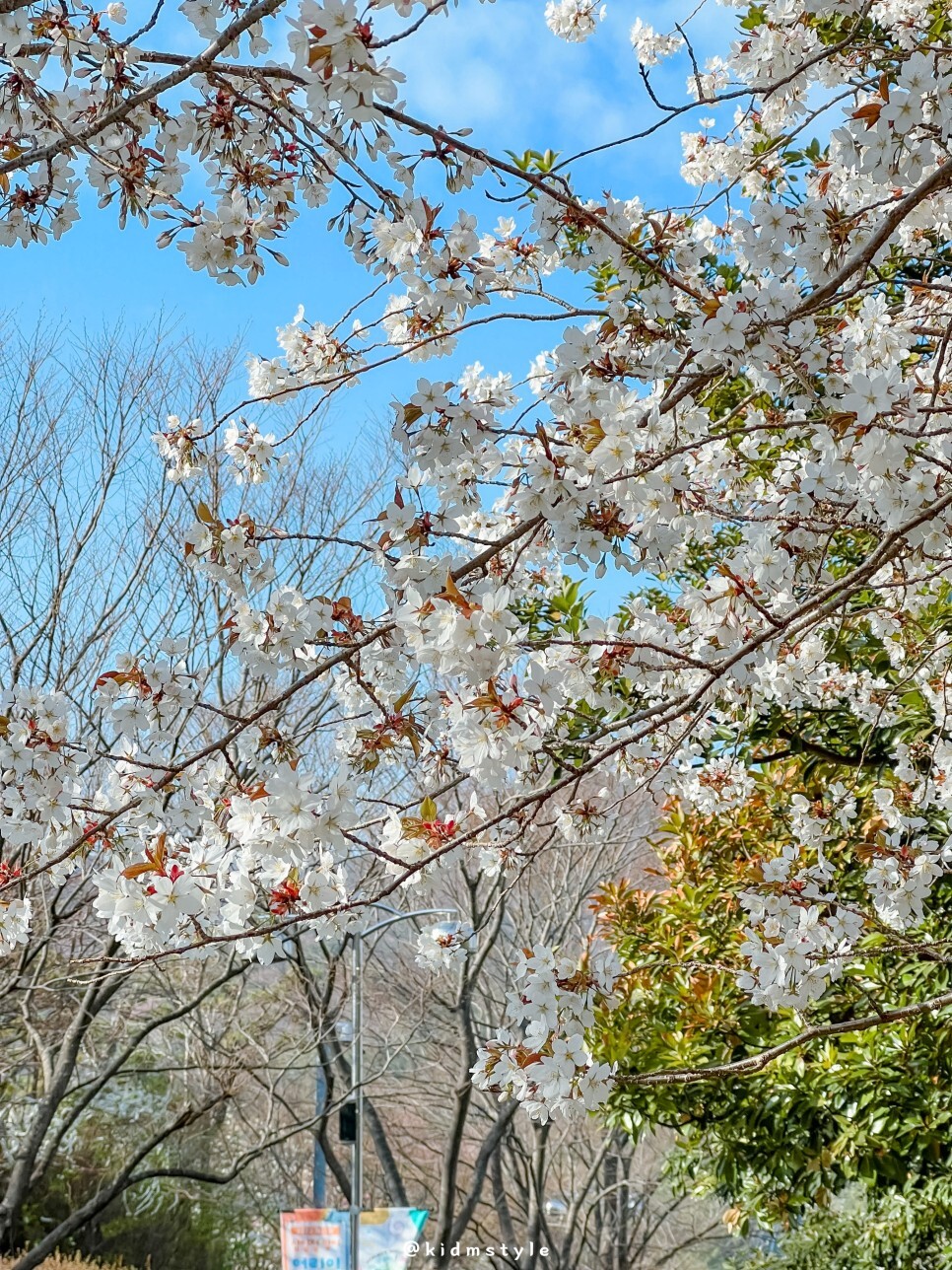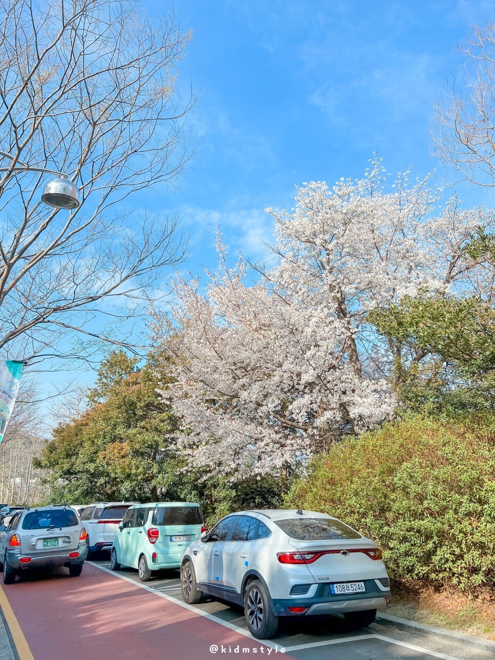 마침 예쁜 색깔의 차가 나무 밑에 주차되어 있네요. 뭔가 잘 어울리는데요? 주말에는 나무 아래 공터에 돗자리도 깔고 피크닉을 즐기려는 분들로 북새통을 이루는 유명한 민주공원 벚꽃 스팟이에요. 매년 지켜보지만 올해는 유독 빨리 폈네요.