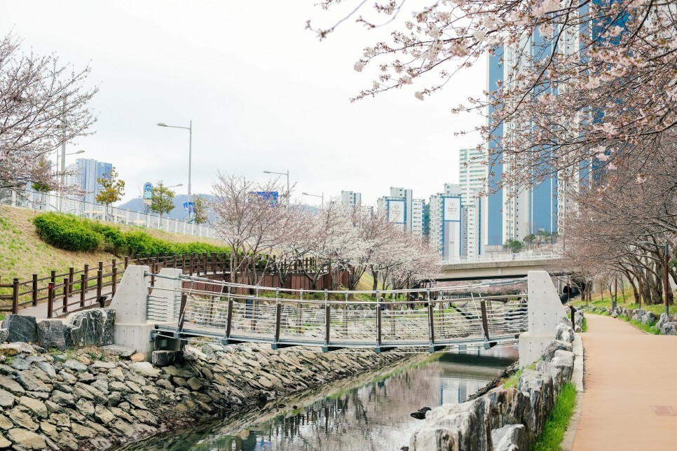 동삼해수천에는 6개의 다리가 놓여 있어요. 각기 다른 모양의 다리인데 2호교가 특히 인기가 많습니다. 벚꽃 향기와 풀 내음이 반겨주는 동삼해수천 참 좋아요.