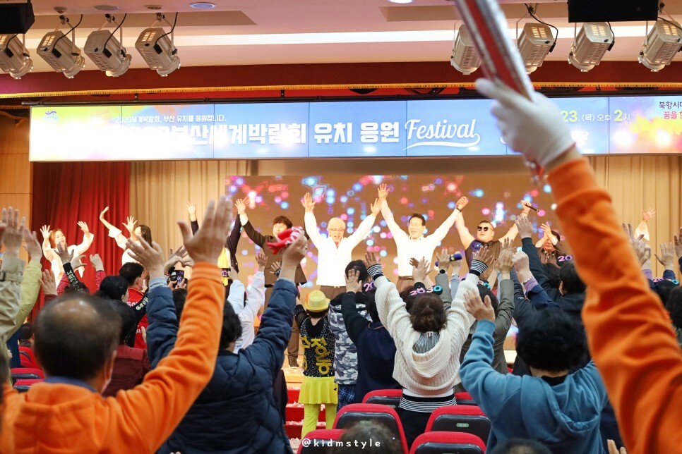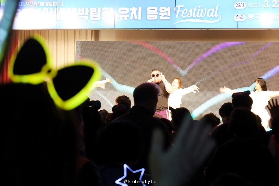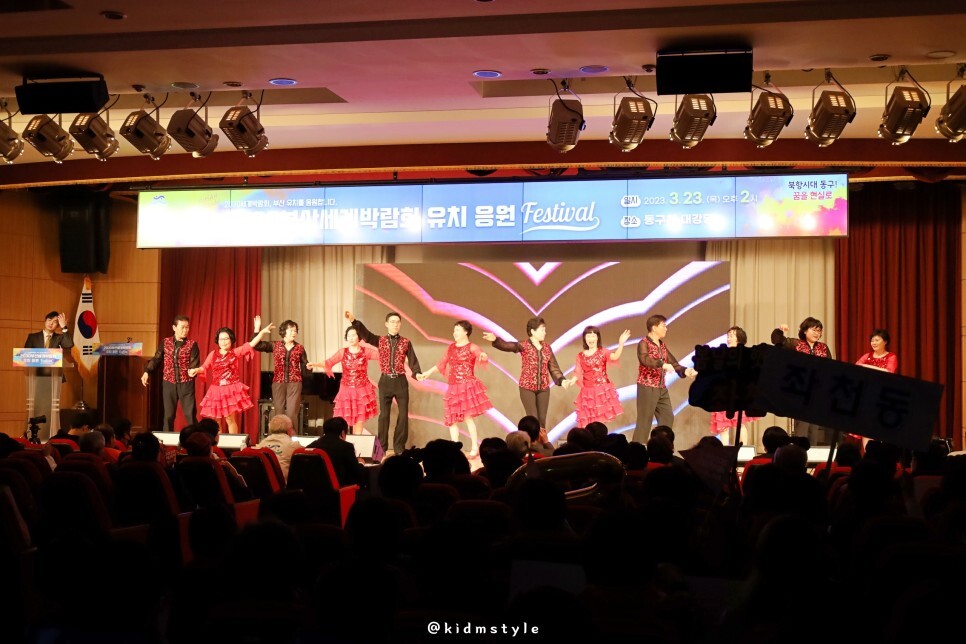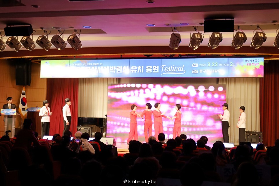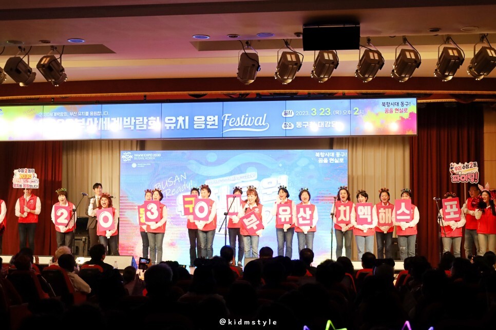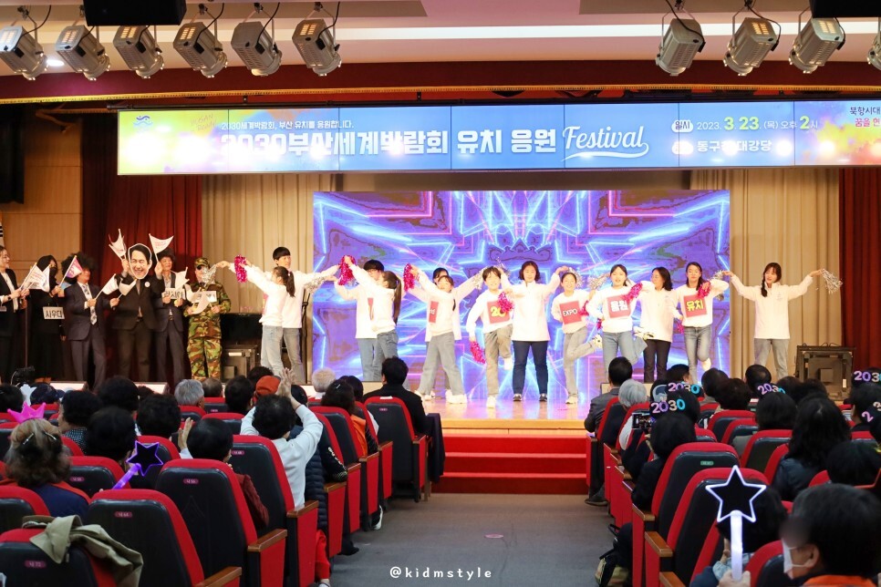 '2030 부산엑스포 동구에 유치해'라는 문구와 함께 환호성이 펼치지는 무대도 즐겁습니다.