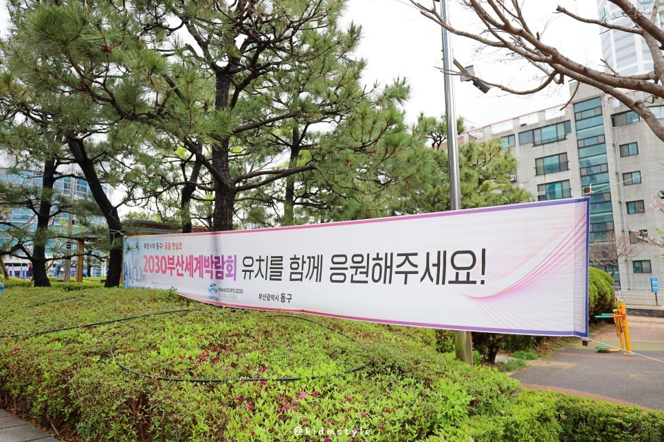 부산 시내 곳곳에 2030 부산세계박람회 유치에 관한 현수막을 볼 수 있는데요. 동구청 마당에도 함께 응원하자는 독려 현수막이 걸려 있었습니다. 현수막뿐만 아니라 대로변의 박람회 유치 응원 깃발, 배너들도 반갑고요. 시내버스에도 멋진 expo 래핑들이 가득한데요. 아래 링크에 제가 촬영한 부산 버스를 구경해 보시는 것 추천드립니다.