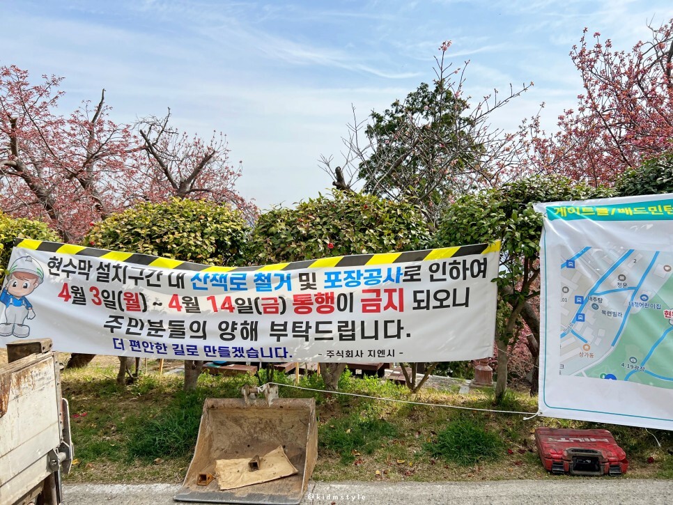 겹벚꽃 동산 옆으로 산책로가 있는데요. 4월 14일까지 산책로 정비 공사 중이라 통행금지입니다. 공사 현장이라 다소 어수선한 분위기입니다. 구경하실 때 주의하셔야 할 것 같아요.