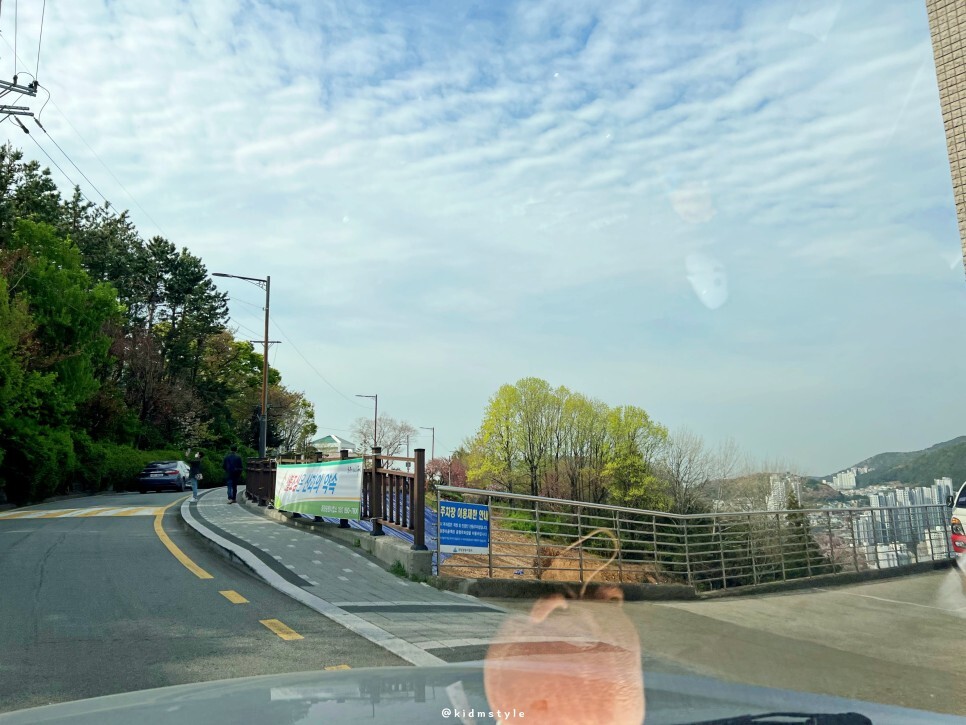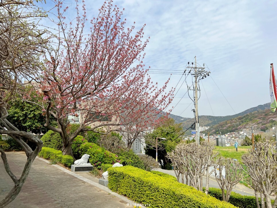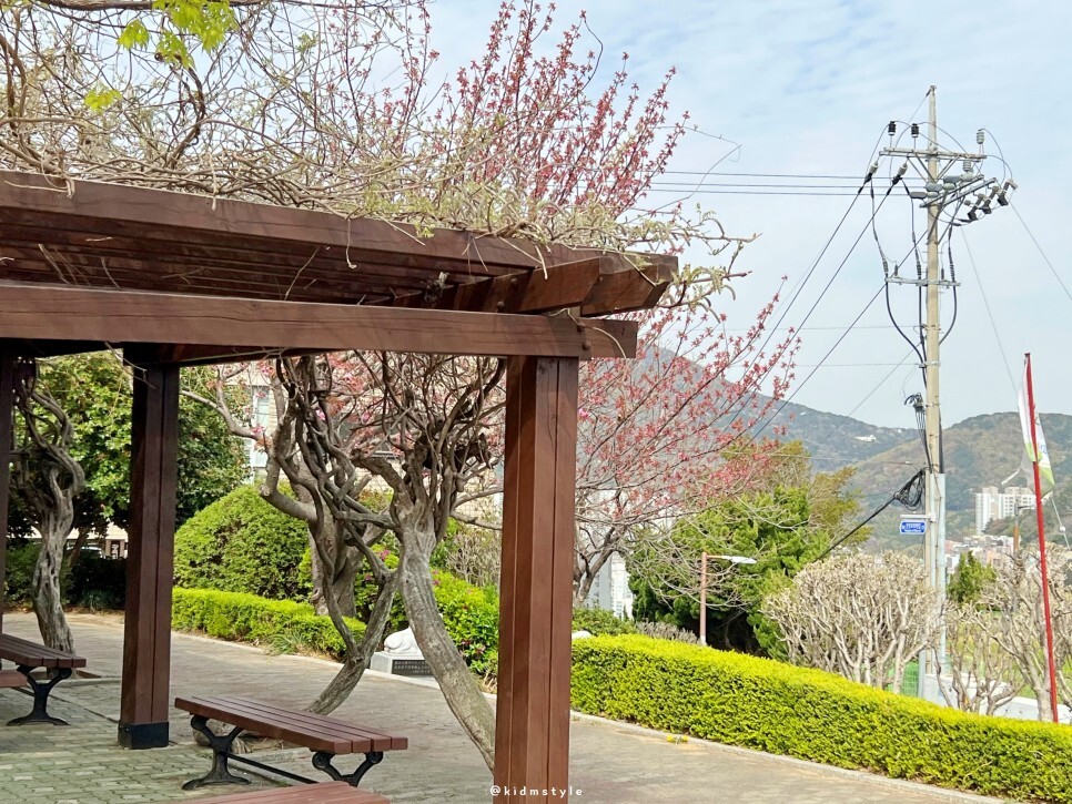 중앙공원 일대, 민주공원 안에는 겹벚꽃이 피는 포인트가 몇 군데 있어요. 먼저 마을버스 포토존으로 알려진 곳으로 가볼게요.