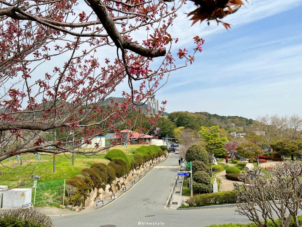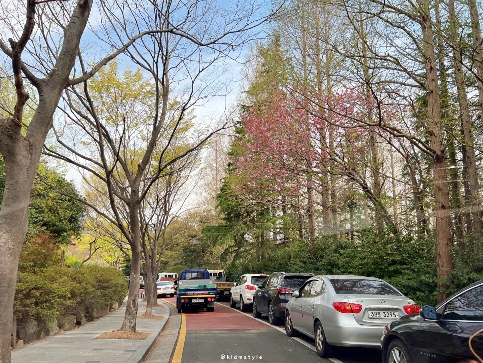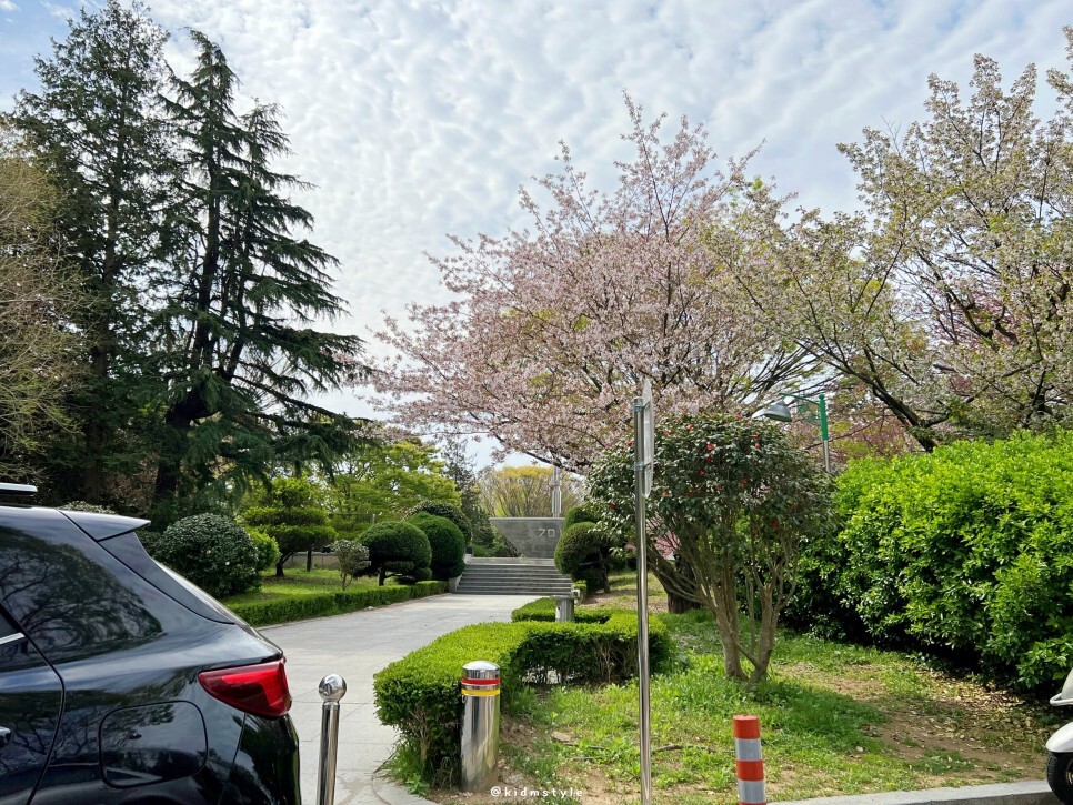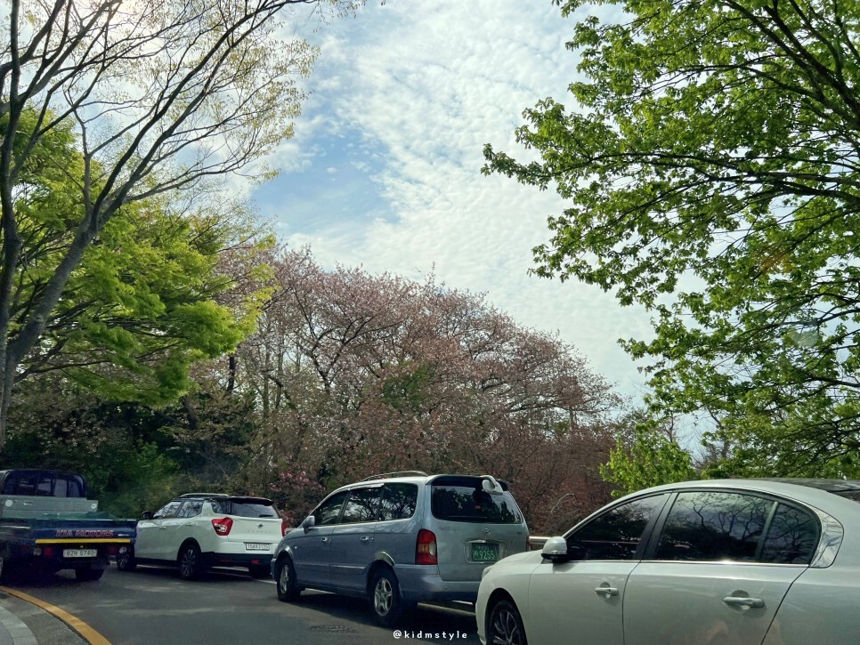 민주공원 순환도로를 돌아봅니다. 오른쪽에 커다란 나무도 겹벚꽃이에요. 진짜 주차할 곳 없네요. 자차로 오신다면 꼭 공원 입구 공영 주차장 주차를 추천드립니다.