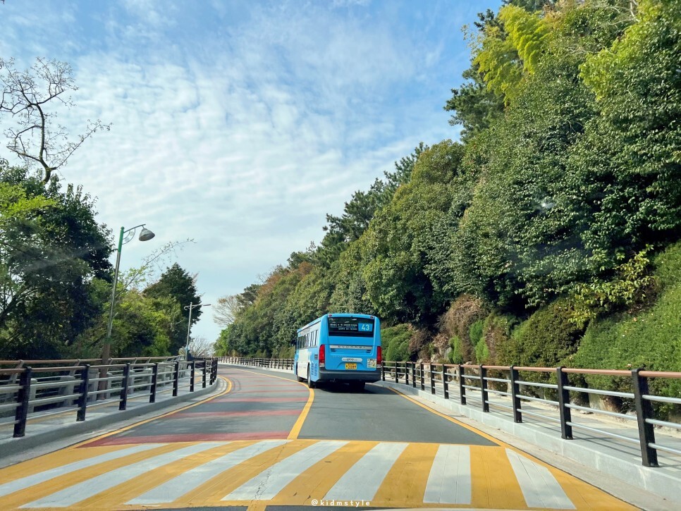 저는 아침 일찍 찾아가 봤습니다. 차에 거치대를 설치하고 촬영한 사진들이므로 참고하시기 바랄게요. 종점을 향해 43번 버스가 열심히 가고 있네요. 저기 몇 미터 앞이 종점이에요. 버스 종점 부근에 위에서 설명한 공영주차장이 있어요.