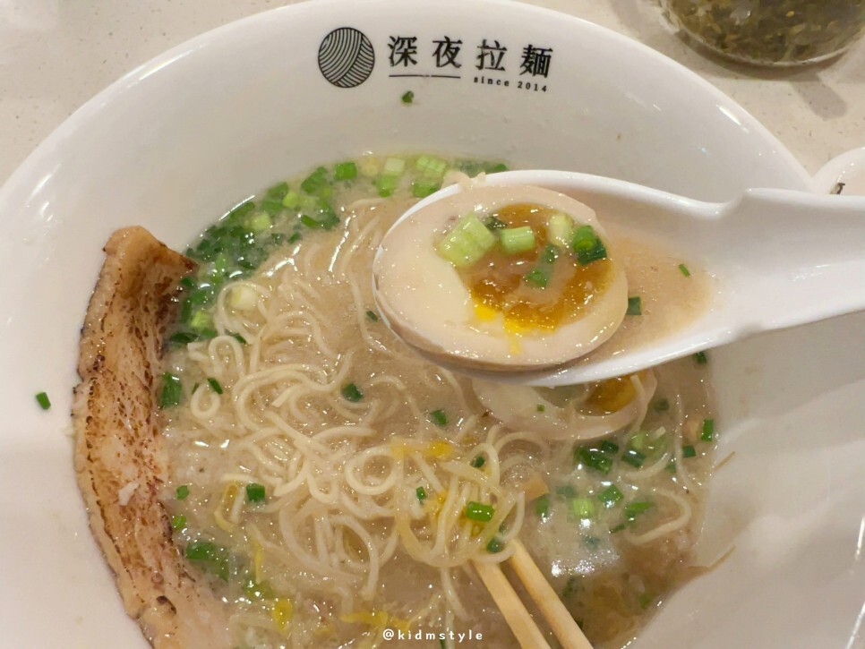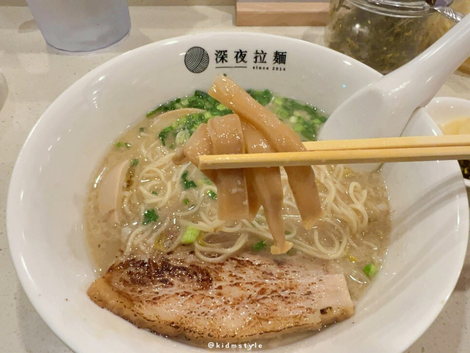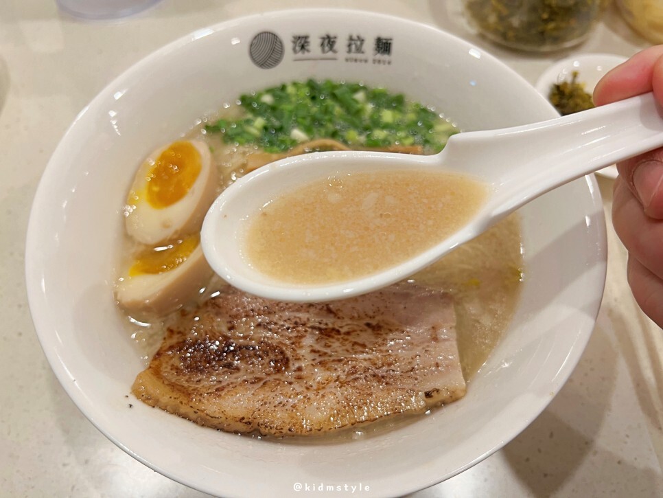 일본 현지에서 맛보는 돈코츠라멘의 느끼한 국물을 좋아하는 제 입에는 약간 라이트 한 느낌입니다. 하지만 그 라이트함이 기분 좋게 다가왔어요. 왜냐하면 아예 한국식으로 로컬화가 되면서 국적불명의 이도저도 아닌 돈코츠라멘이 된 느낌이 아니라 염도만 낮추고 본연의 묵직함은 가지고 있기 때문입니다.
