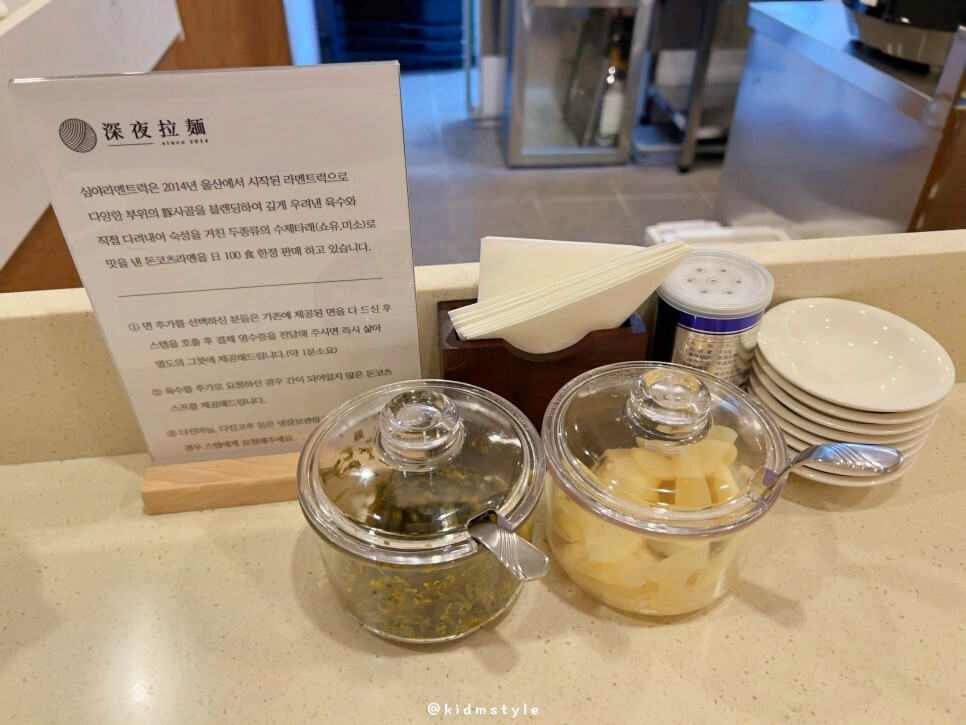 그리고 육수가 모자랄 때 추가 요청을 하면 간이 되어 있지 않은 돈코츠 스프를 제공한다고 합니다. 다진 마늘, 다진 고추는 요청을 하면 따로 내어 준다고 하네요.
