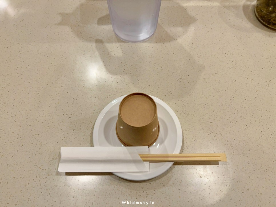 고민하지 않고 바로 앞 코너 자리에 앉습니다. 앞접시, 종이컵, 젓가락이 깔끔하게 세팅되어 있네요. 식당에 가면 어디에 앉을지 고민은 잘 안 하는 편이에요. 들어갔을 때 바로 앞에 보이는 가운데 자리 선호합니다. 그 자리가 뭔가를 요청하기도 편하고 피드백도 잘 되며 보통 간격이 넓거든요.