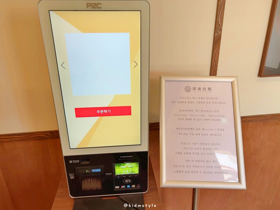 궁금증을 안고 입장하니 키오스크가 입구에 있네요. 주문과 결제를 하고 들어가면 됩니다. 실내에 너무 시끄럽지도 너무 조용하지도 않은 적당한 음량의 음악이 잔잔하게 깔리는데 분위기가 참 좋습니다. 기대감이 확 올라가네요.
