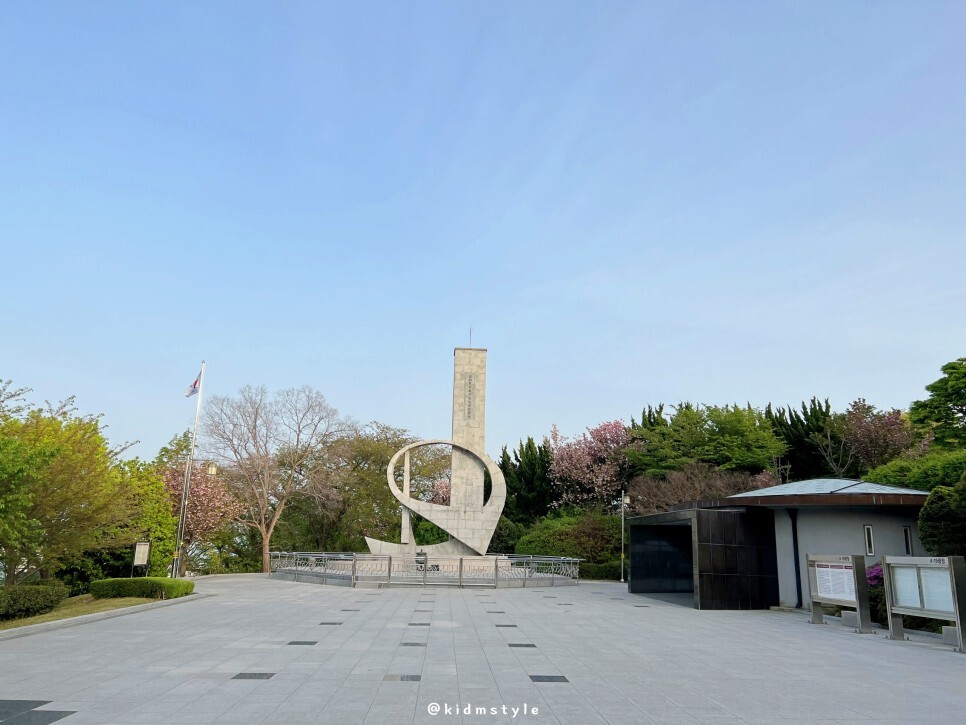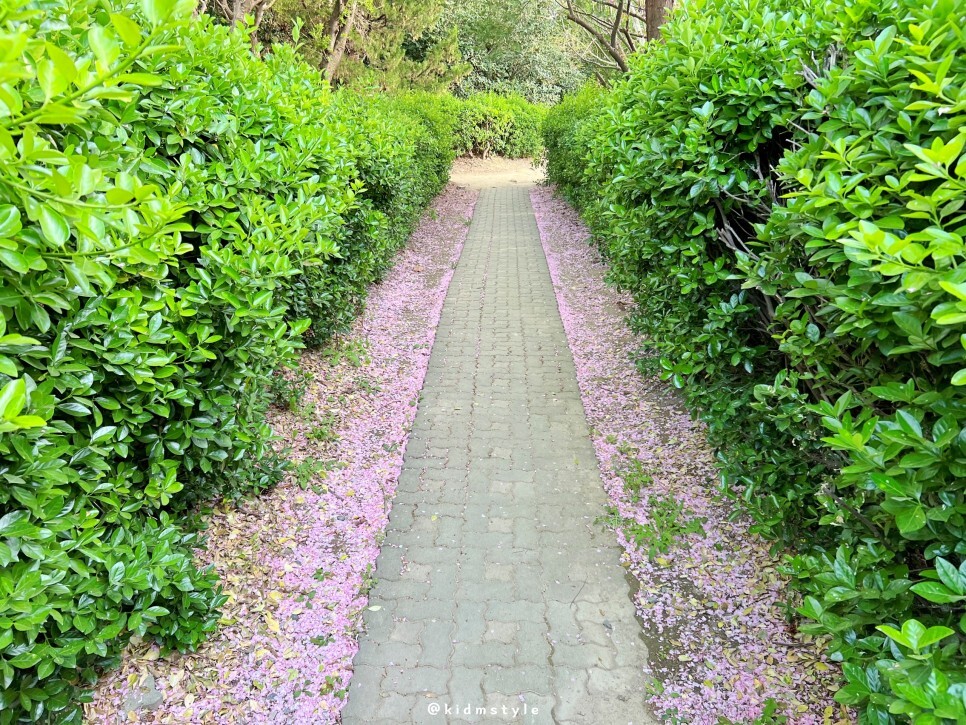 701 전승기념비에 왔습니다. 저 앞에 커다란 나무가 포토스팟이에요. 여기에는 꽃잎이 조금씩 떨어진 모습이 보이네요.