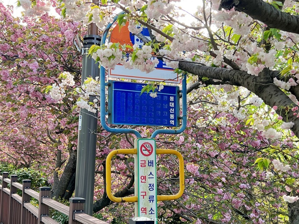 오늘도 부산시립 중앙도서관 마을버스 정류장에서 시작해 봅니다. 커다란 겹벚꽃 나무가 정말 멋들어지게 피어있는 모습이 참 아름답습니다.