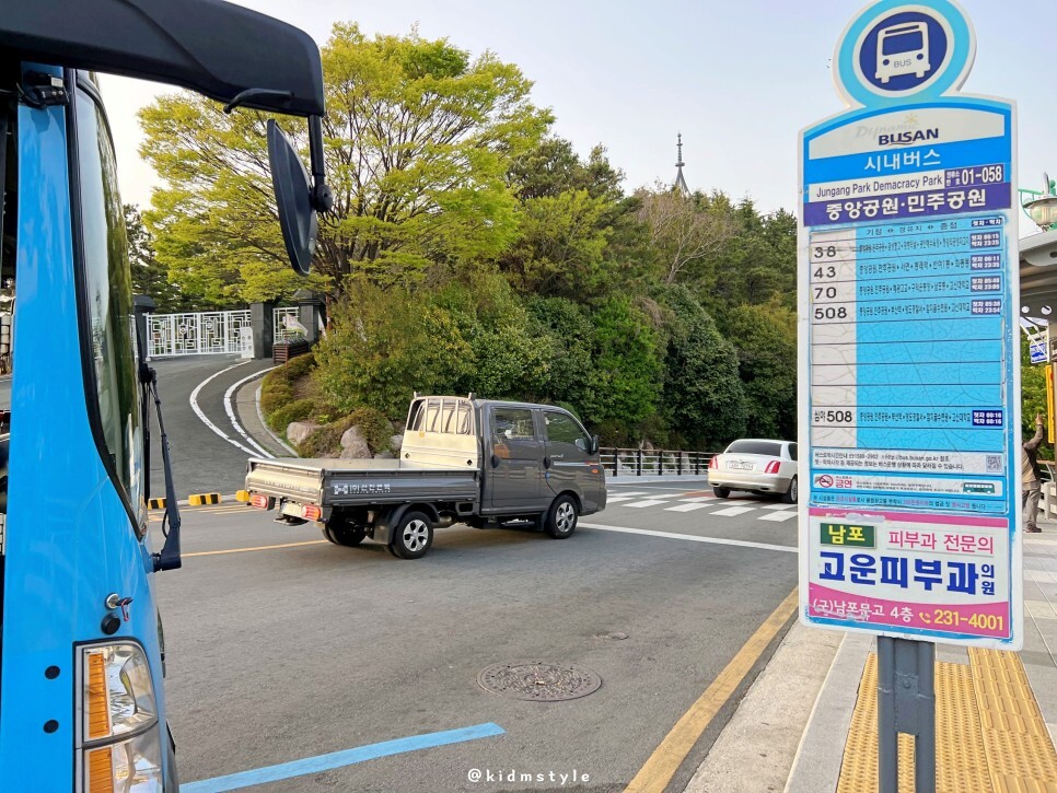 시내버스 종점이에요. 38번, 43번, 70번, 508번 버스가 와요. 그리고 중구 1번 마을버스도 지난답니다.