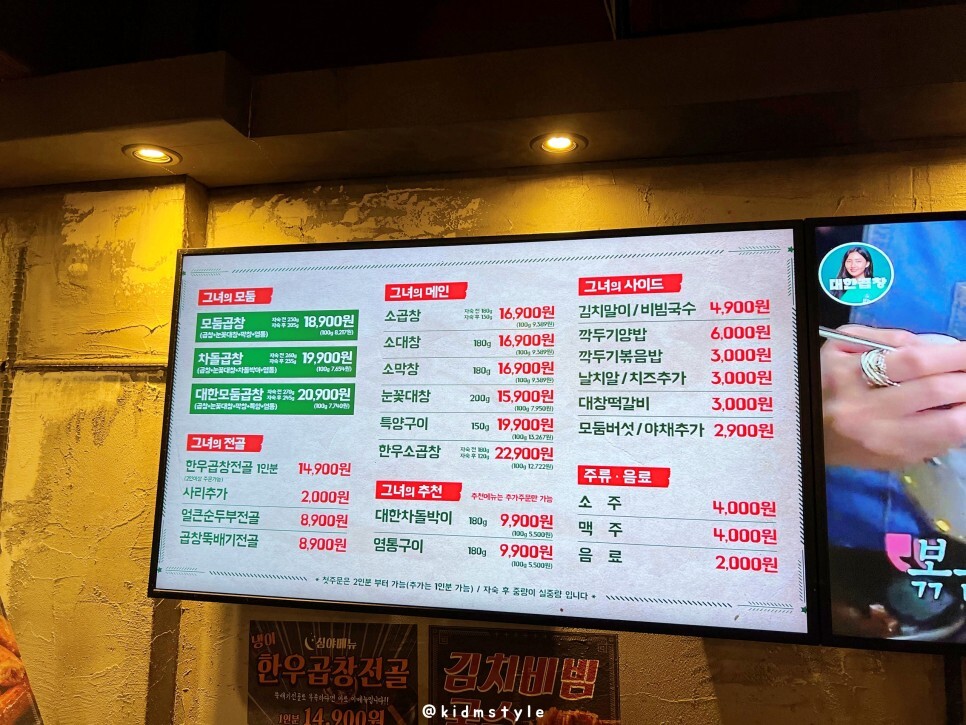 메뉴판입니다. 가격 변동이 있을 수도 있습니다. 이미 식사를 하고 와서 대한모둠곱창 하나 주문했네요.