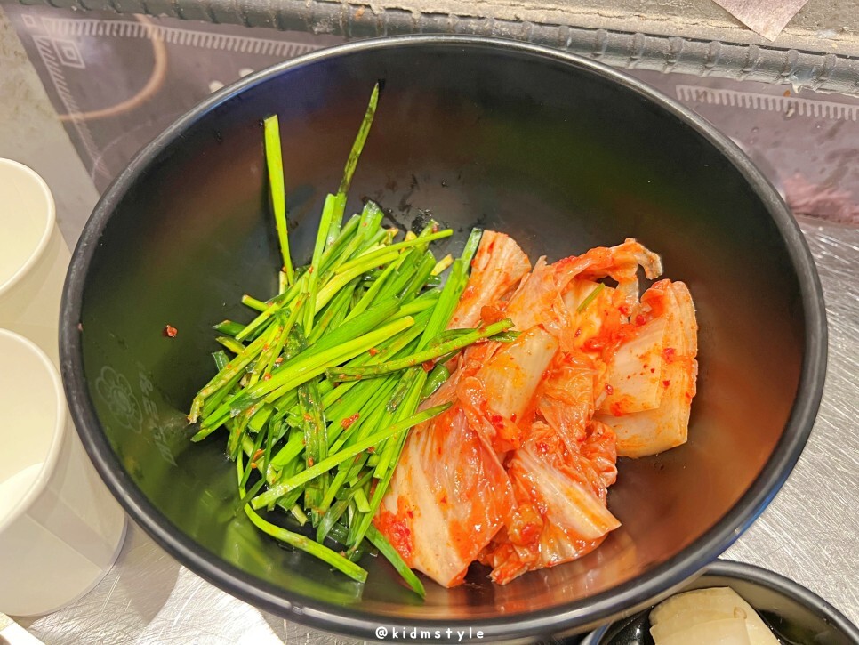 곱창에 볶을 부추와 김치에요.