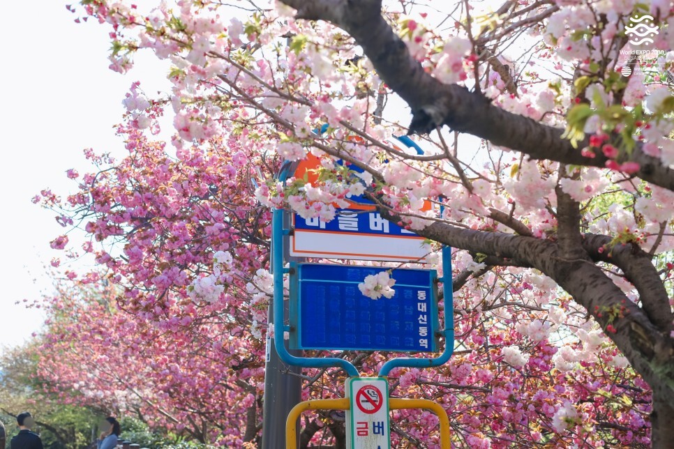 민주공원에는 다양한 겹벚꽃 포토스팟이 있는데요. 먼저 부산시립 중앙도서관 앞 마을버스 정류장으로 향합니다. 마침 사진사 한 분이 열심히 풍경을 담고 계시네요. 반가운 인사를 나누며 잠시 대화를 나누어봅니다.
