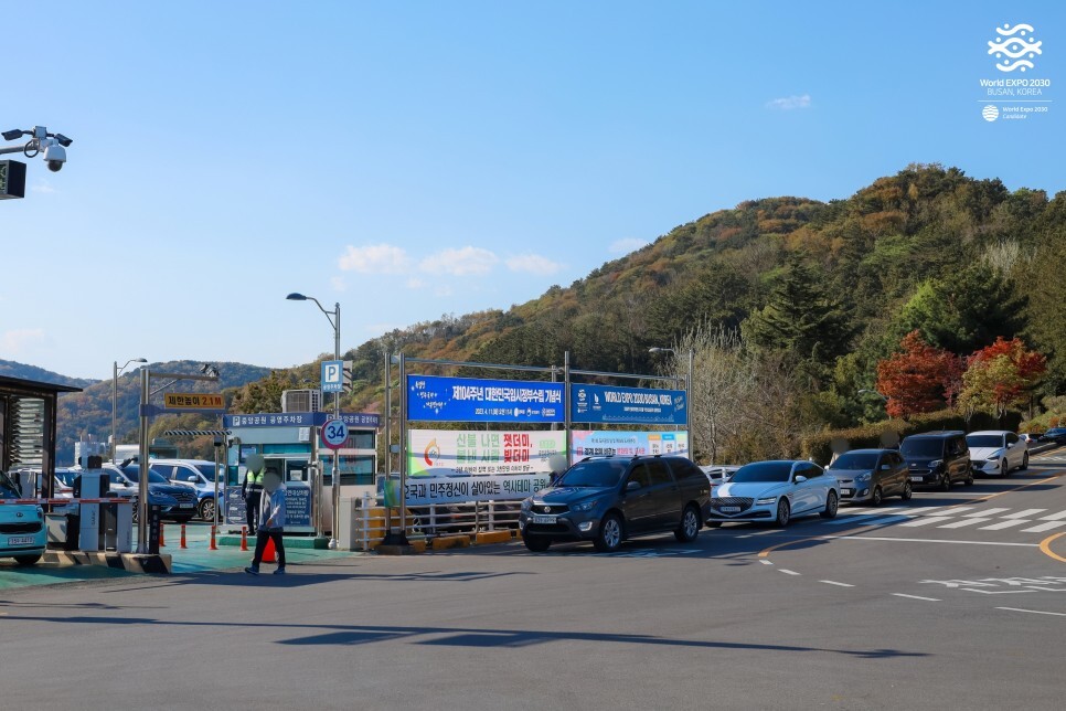 겹벚꽃이 한창이던 주말 오후 찾았습니다. 중앙공원 공영주차장에는 주차를 위해 대기하는 차로 줄이 긴 모습이에요. 대중교통 이용을 추천드립니다. 부산역에서 508번, 43번 버스를 타시고 종점에서 내리시면 됩니다.