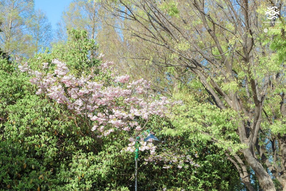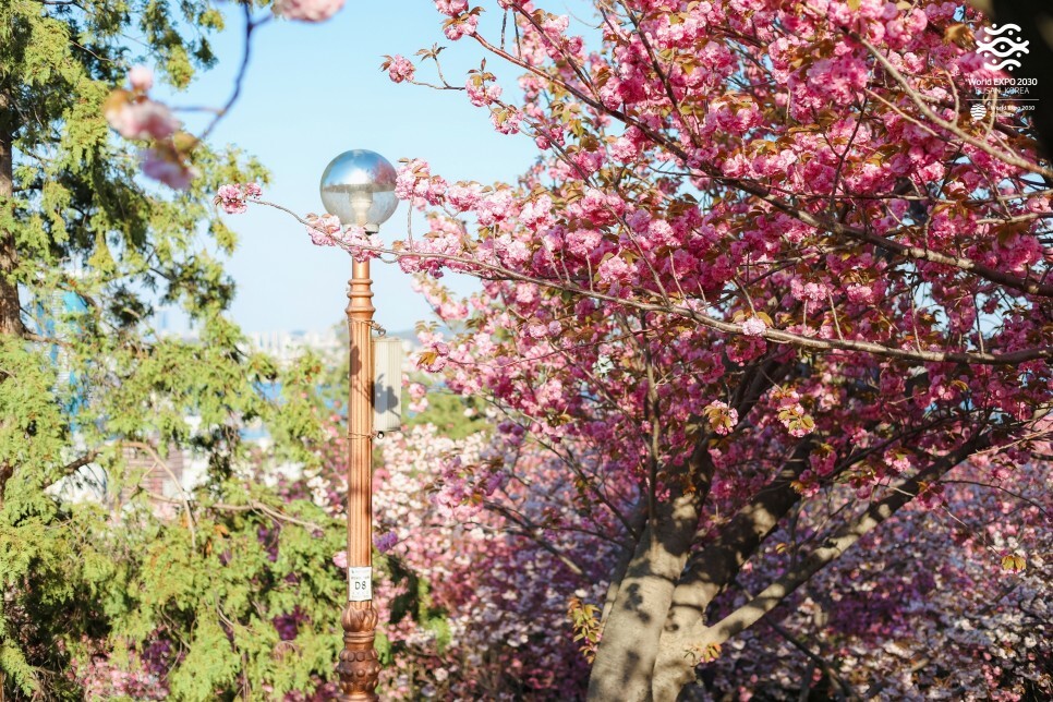 저녁에는 가로등도 켜져요. 밤에 바라보는 겹벚꽃도 꽤 운치 있어요. 아침, 오후, 저녁이 모두 아름다운 민주공원 겹벚꽃 동산입니다.