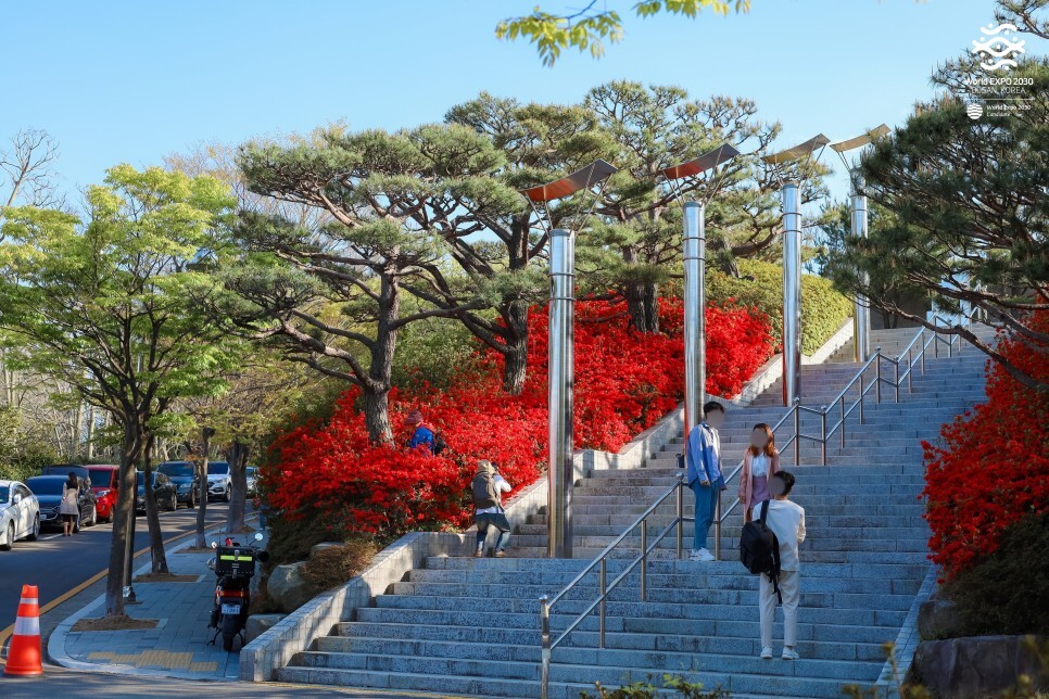 왼쪽은 겹벚꽃 동산, 오른쪽은 민주항쟁기념관으로 오르는 계단인데요. 계단 양쪽에 강렬한 색깔로 존재감을 보여주는 붉은색의 영산홍도 반가워요.