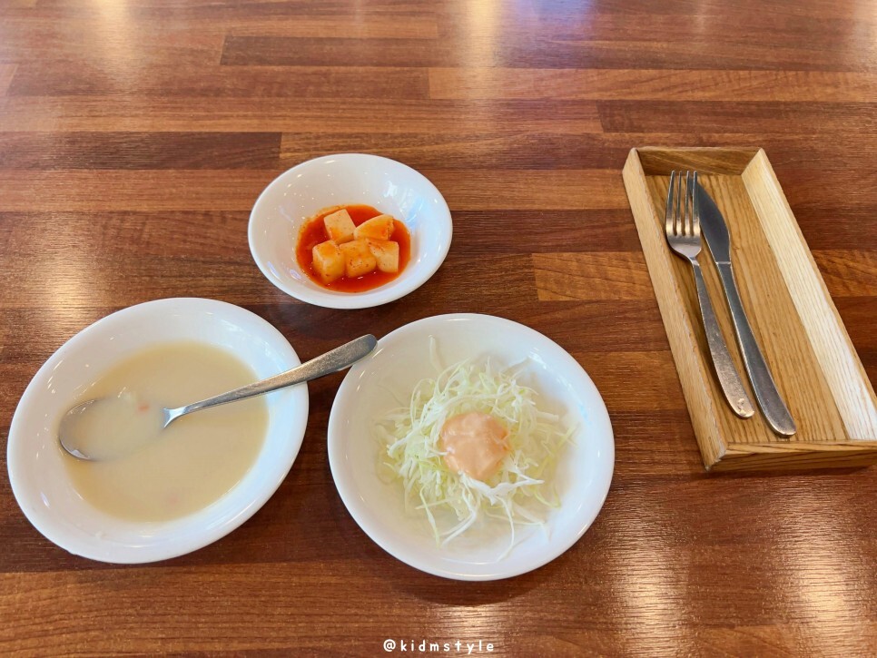 스프, 깍두기, 양배추 샐러드가 나왔네요. 스프는 고소하고 맛이 좋아요.