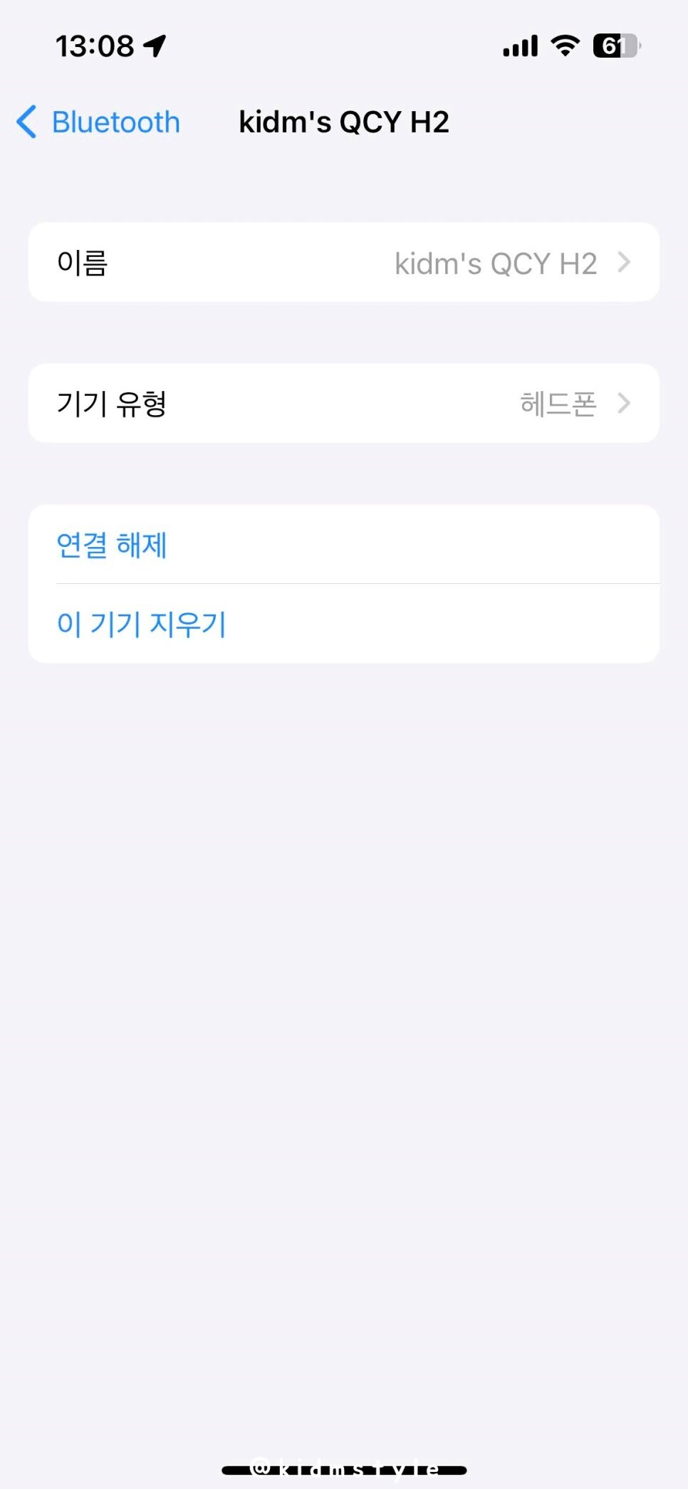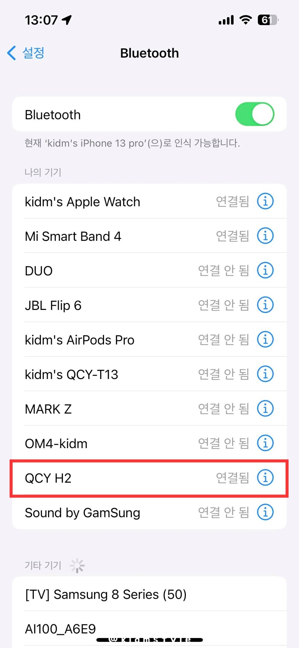 아이폰에 블루투스 연결을 하면 바로 잡힙니다. 기존에 QCY 제품을 몇 개 써본 터라 음질이 꽤 기대가 됩니다. T5, T13은 꽤 만족하면서 사용 중이거든요. 가성비 최고예요.