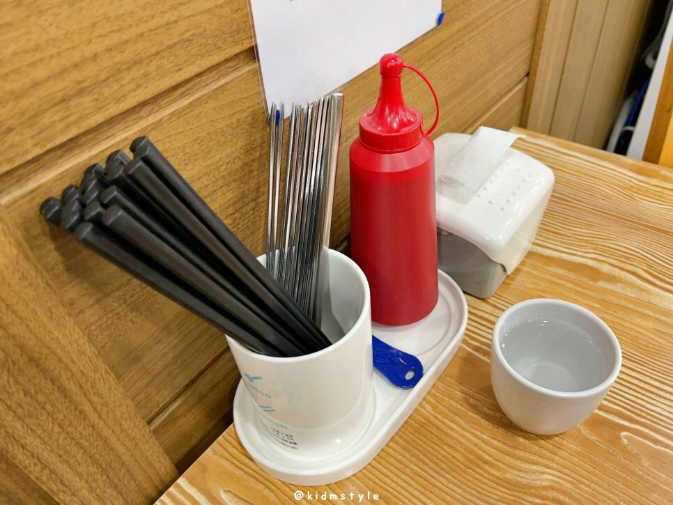 테이블에 보면 수저와 매콤한 칠리소스가 세팅되어 있고요.