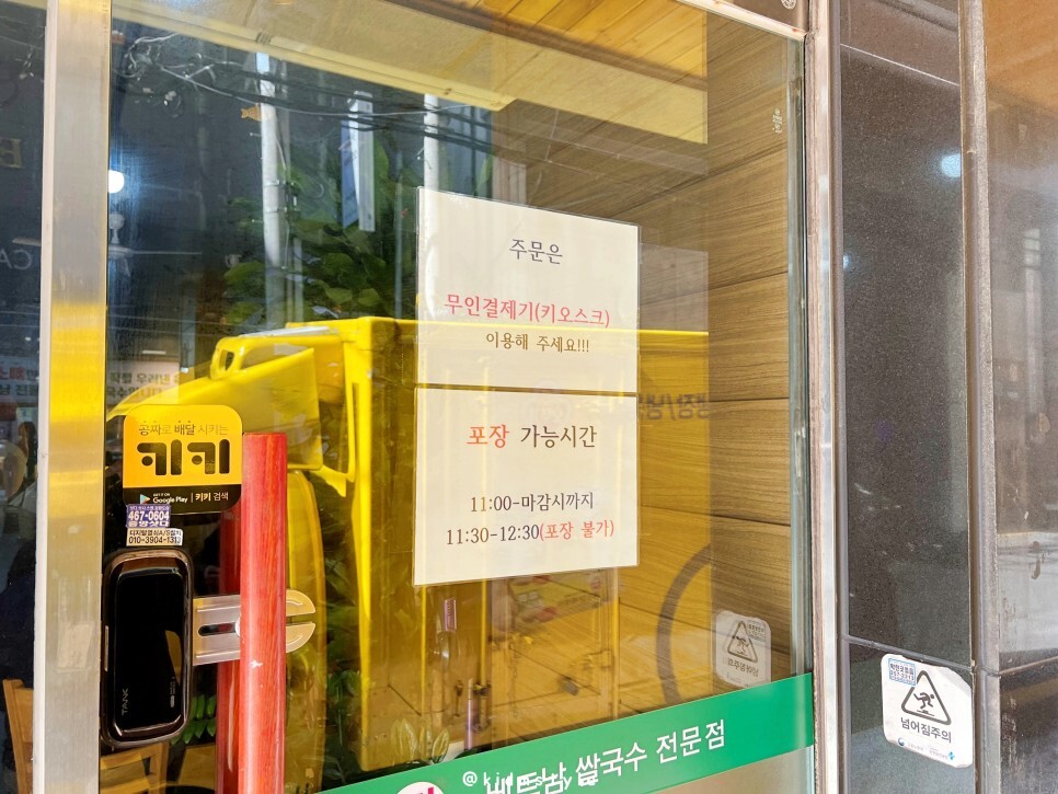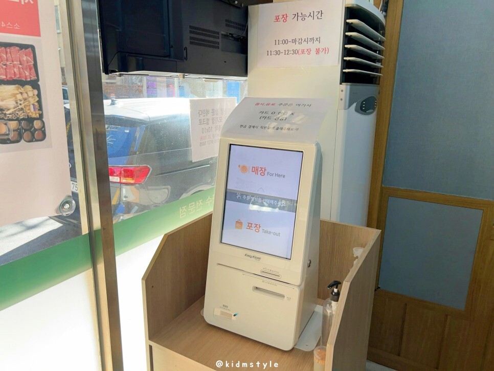 주문 및 결제는 키오스크로 해야 하며 포장도 되는데 바쁜 시간에는 불가입니다.