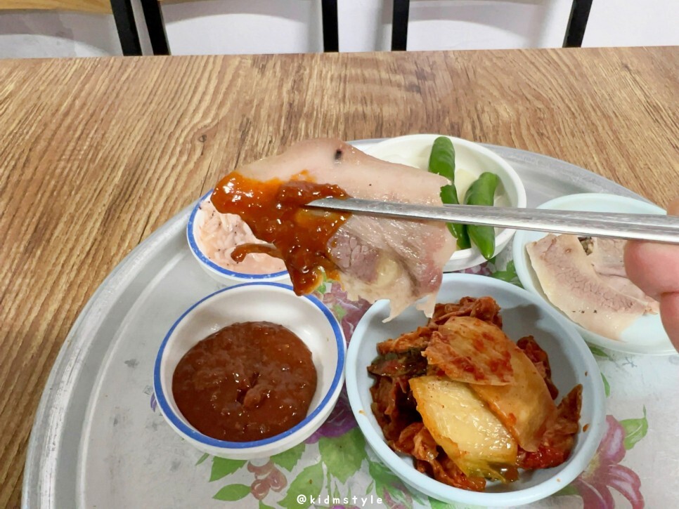 쌈장 듬뿍 찍어서 머리고기를 한 점 맛봅니다. 소주 생각이 간절한데요. 참겠습니다.