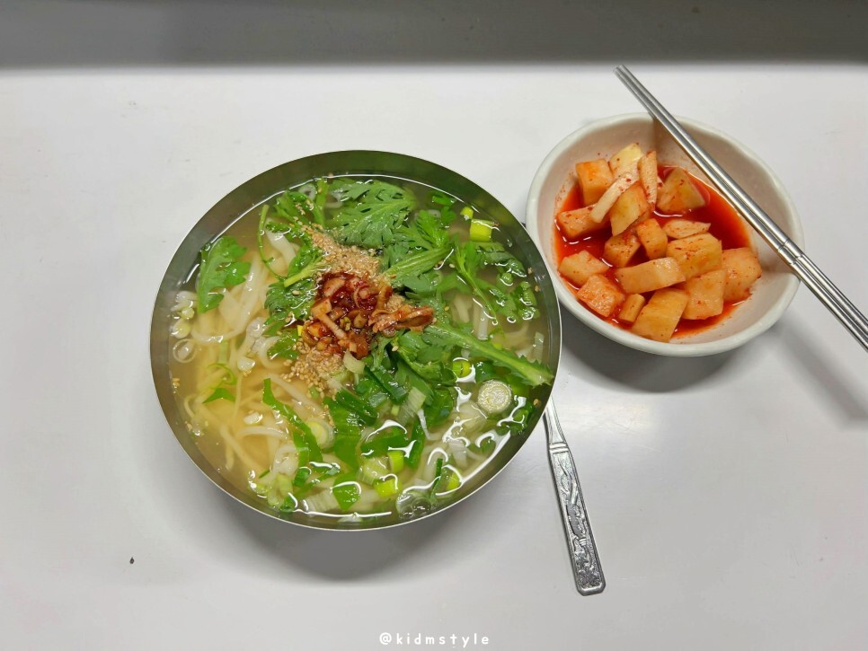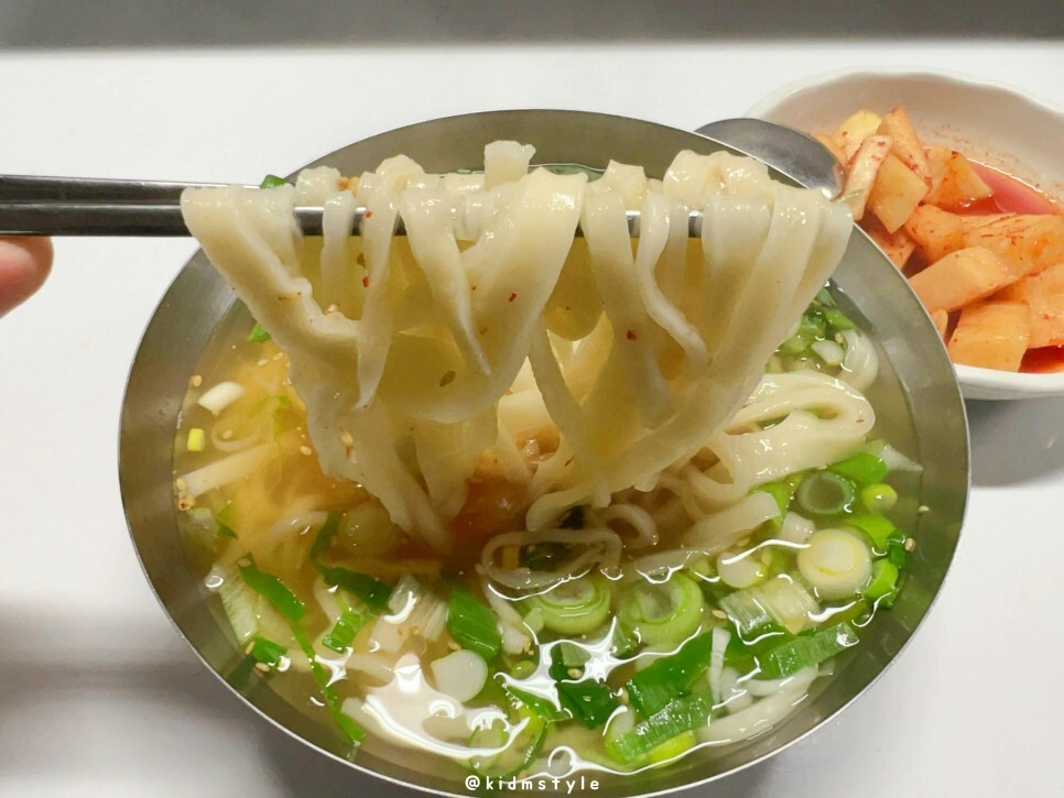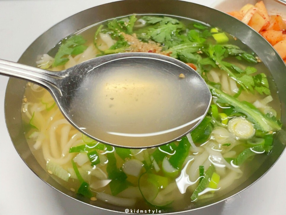 멸치 베이스의 깔끔한 국물입니다. 진하고 깊은 칼국수와는 느낌이 좀 다릅니다.