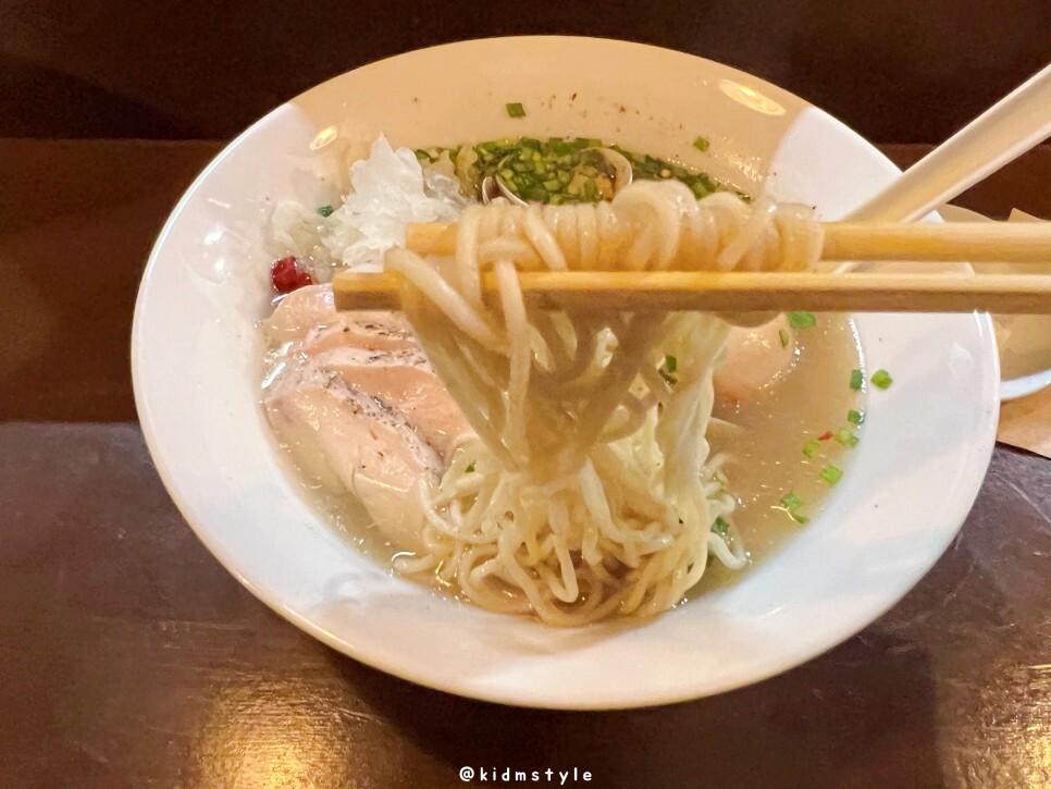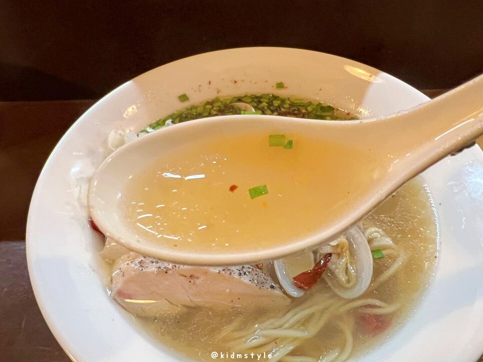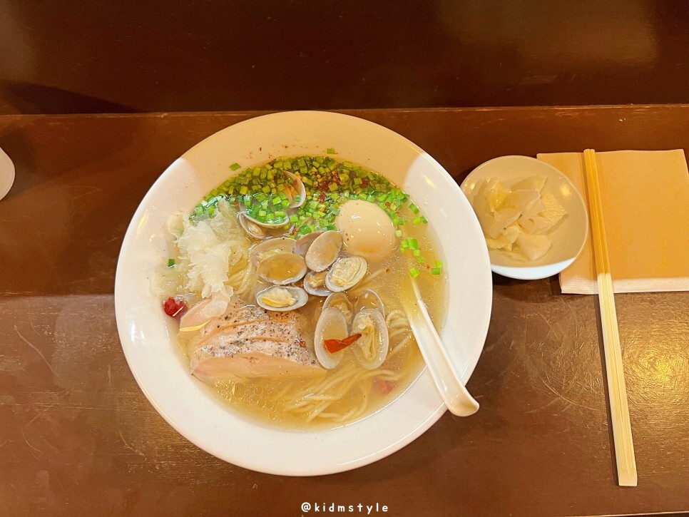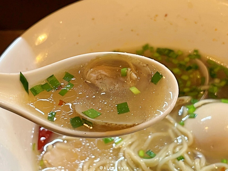국물을 먼저 떠봅니다. 아주 진한 바지락 육수입니다. 후기를 몇 개 보니 바지락라멘 국물이 상당히 짜다는 후기가 좀 있던데요. 평소 일본 현지 라멘 스타일을 즐기는 제 입에는 염도가 생각보다 안 높네요.