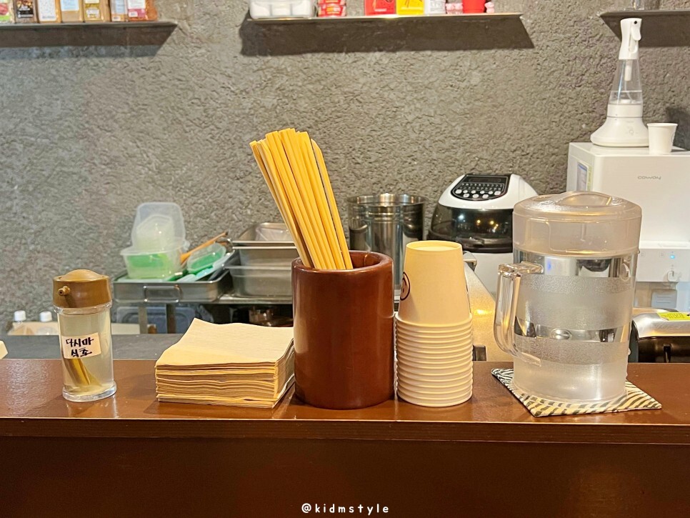 다시마 식초, 냅킨, 젓가락, 물컵 등이 있어요. 남자 사장님이 친절하십니다.