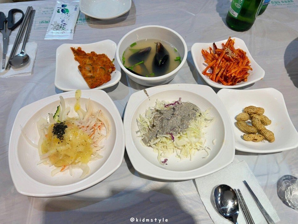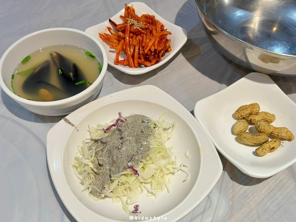 홍합탕, 오징어무침, 양배추 샐러드도 나옵니다.