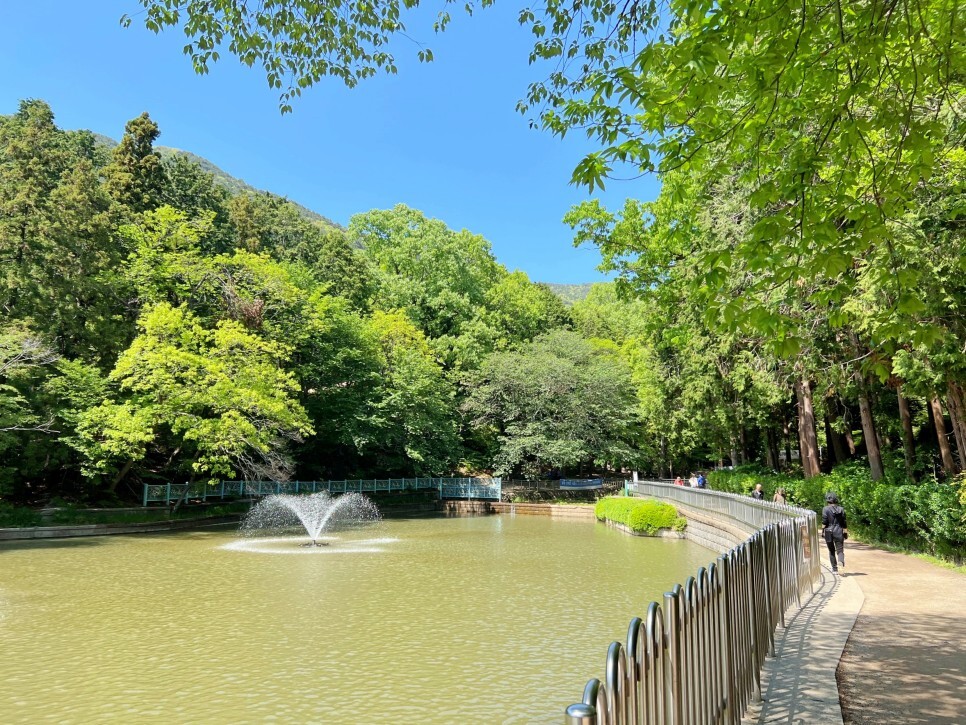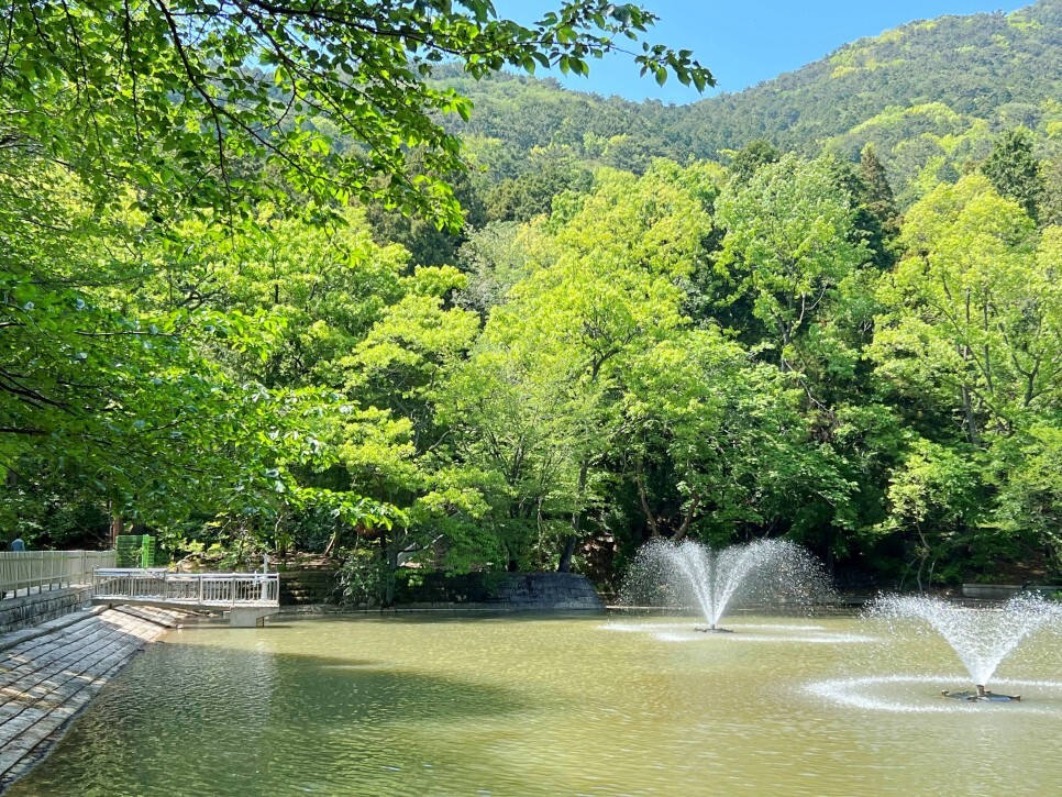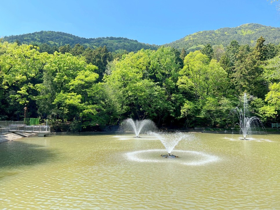 공원에는 작은 수원지가 있어요. 수심이 4m 이상 되는 곳이랍니다. 때에 따라 분수도 작동하는데요. 마침 타이밍이 잘 맞았습니다. 분수가 눈에 들어오네요.