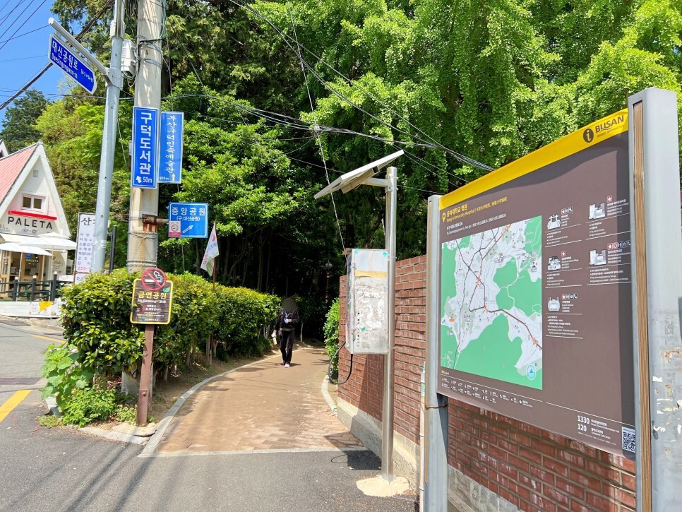 왼쪽으로 가면 구덕도서관이 자리하고 있고요. 정면에 보이는 길이 공원으로 들어가는 입구에요. 원래 대신공원이라고 불렀는데 정식 명칭은 중앙공원이랍니다. 그래도 아직 주민들은 대신공원이라고 부른답니다.