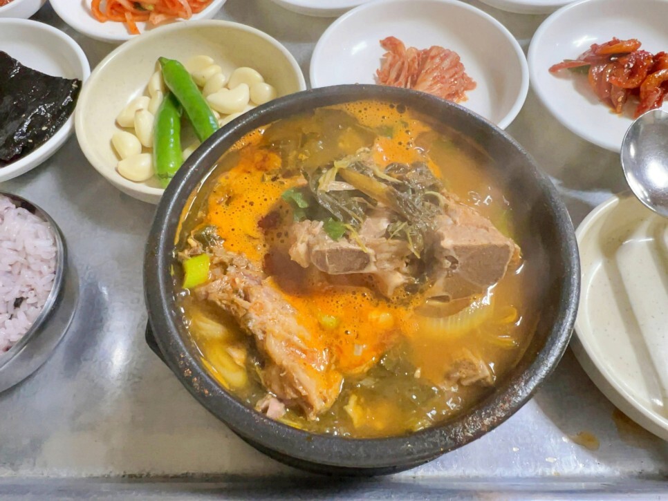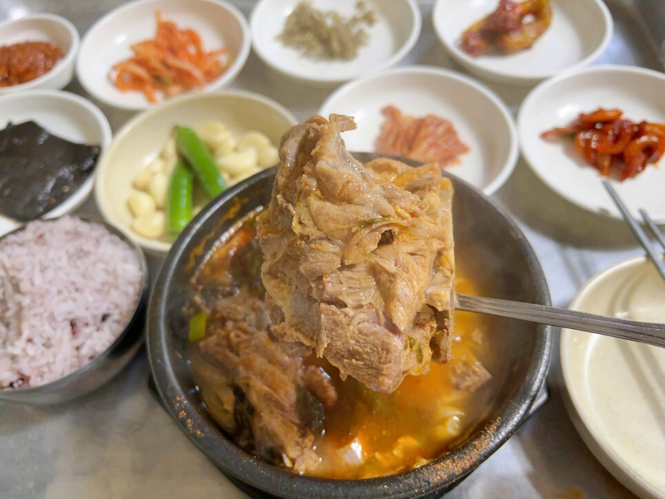 뜨끈한 국물을 한 숟가락 맛봅니다. 이집 뼈다귀해장국을 좋아하는 이유가 자극적이지 않고 간이 딱 좋아요. 그래서 호불호도 안 갈리고 근처 직장인들에게, 동네 주민들에게 인기가 많답니다.
