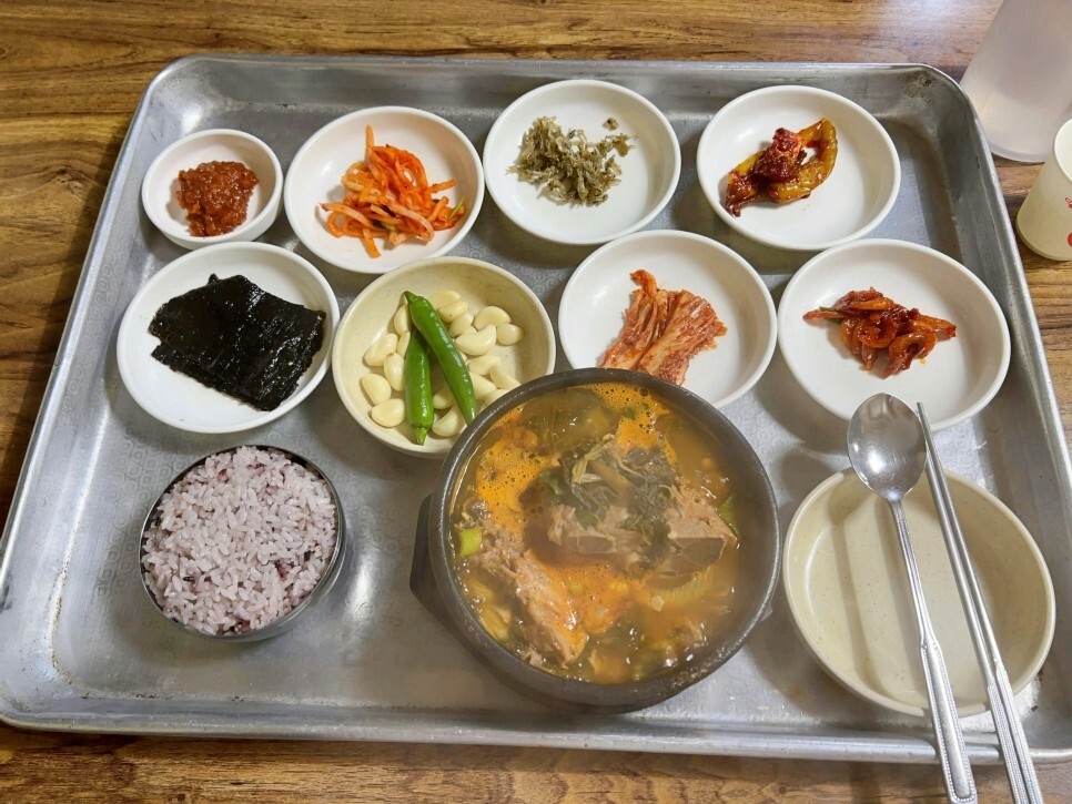 예전에 한참 다니다가 오래간만에 찾은 식당이라 추억에 젖어 있을 때쯤 주문한 뼈다귀해장국 한 상이 나왔습니다. 반찬도 종류가 꽤 많죠?