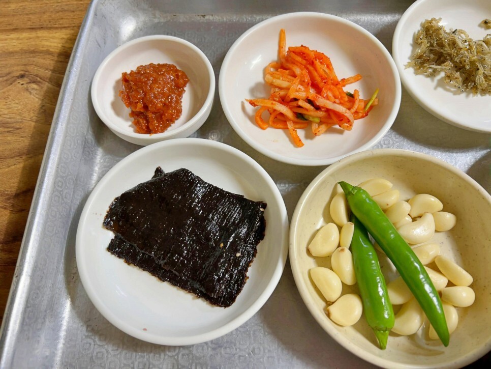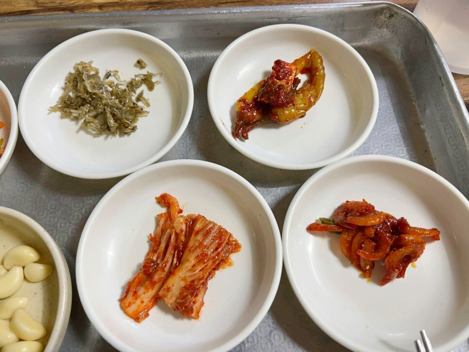 마늘, 고추, 쌈장을 제외하고도 반찬은 6가지가 나오는데요. 된장찌개 등 찌개 정식을 주문해도 반찬의 가짓수는 똑같습니다. 뼈해장국에도 이렇게 반찬이 다 나오니 좋습니다.