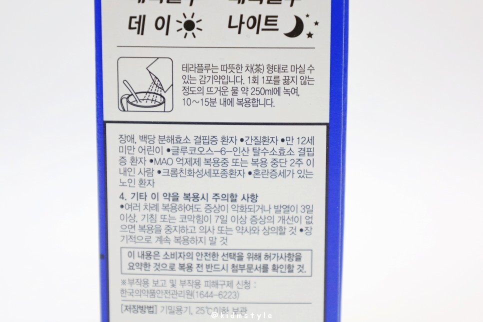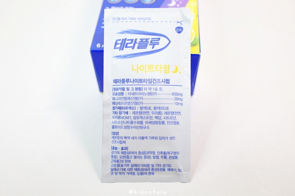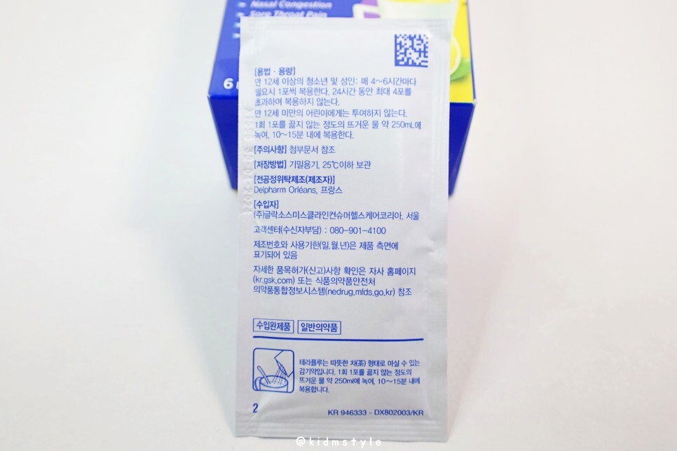 테라플루는 레몬 향이 들어가서 그런지 차 한잔하는 느낌입니다. 효과는 개인마다 다르겠지만 저는 효과가 좋아서 늘 상비해두는 약입니다.