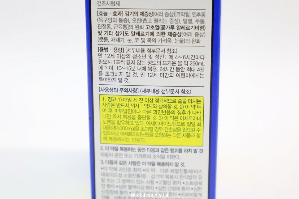만 12세 이상의 청소년 및 성인이 사용하여야 합니다. 그리고 아세트아미노펜은 일일 최대용량인 4,000mg을 초과할 경우 간손상을 일으킬 수 있으므로 조심하세요. 과유불급입니다.