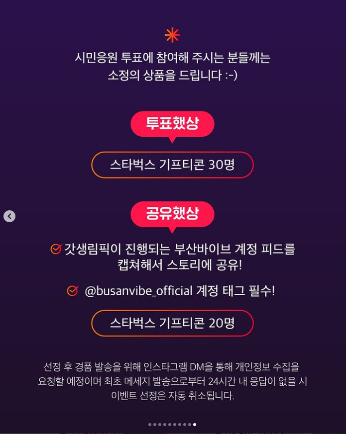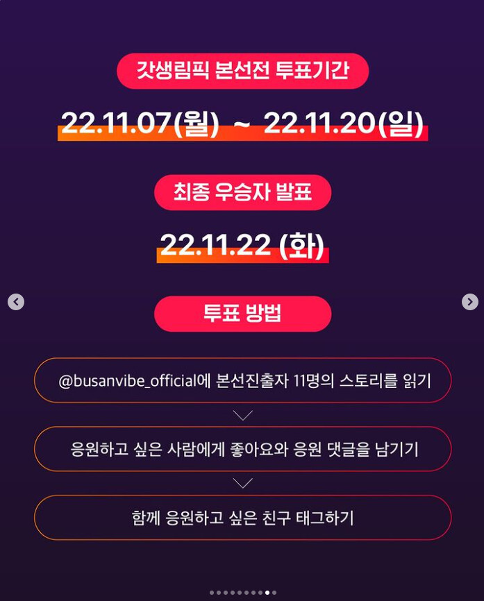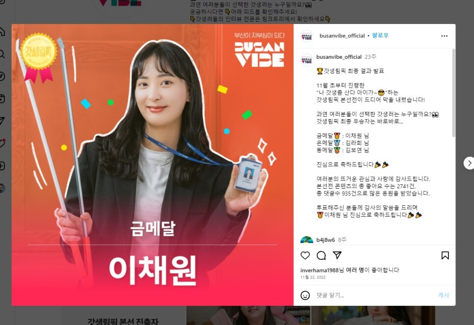부산 바이브 인스타그램 @busanvibe_official에서 갓생림픽 본선 진출자의 스토리를 소개하고 각자가 마음에 드는 이야기를 응원하기도 했습니다.