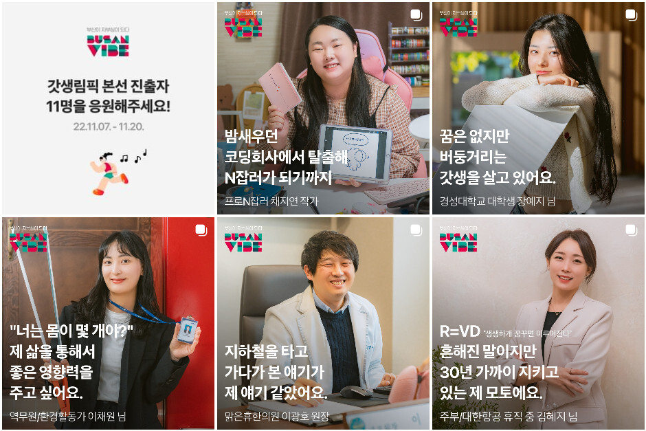 작가, 교사, 대학생, 대표, 주부 등 다양한 분야에서 갓생을 살고 있는 11명의 스토리가 부산시 공식 sns, 부산 바이브 홈페이지 등에 소개되어 시민들에게 많은 관심을 받았는데요.