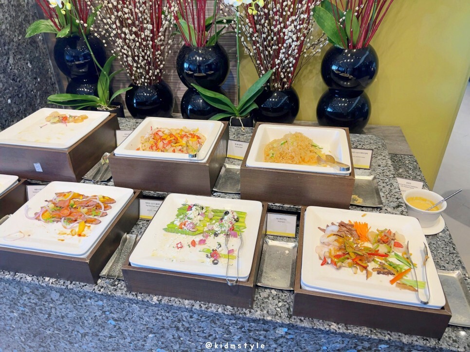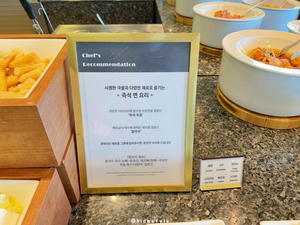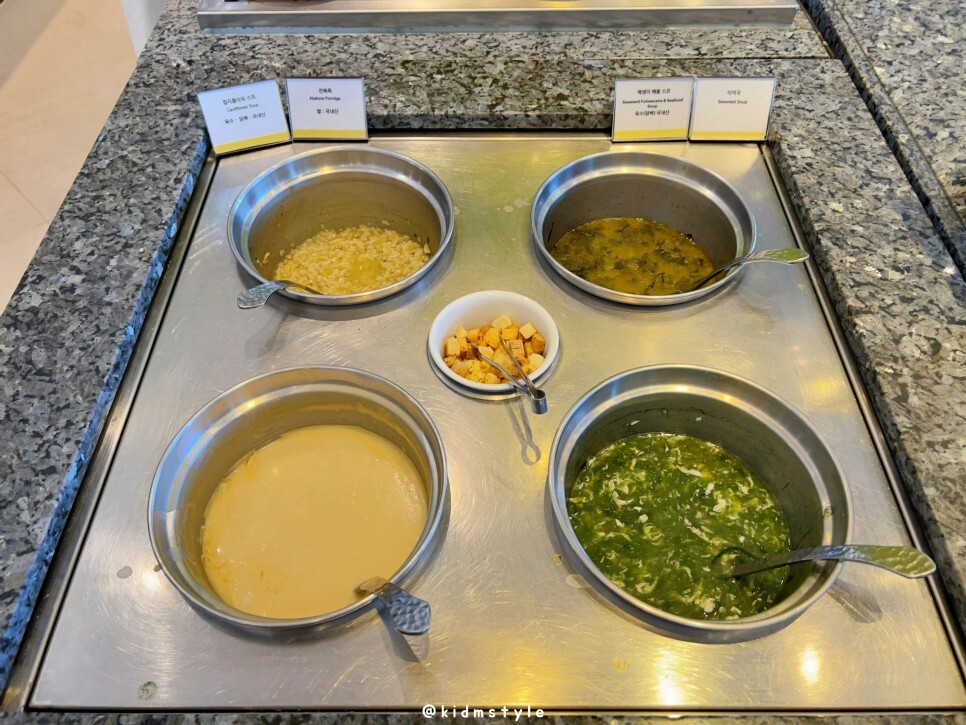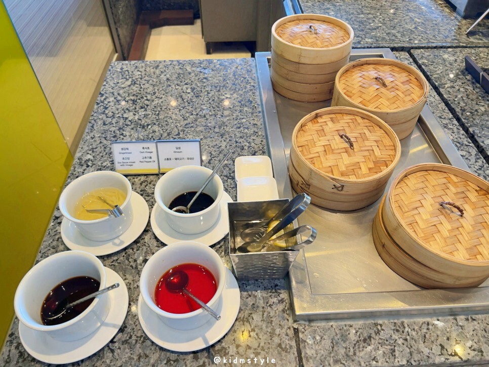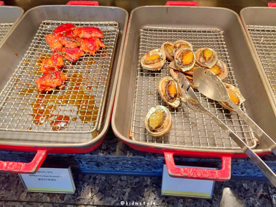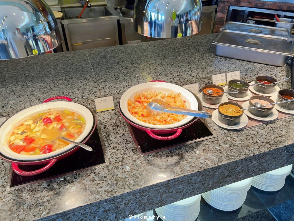 중식 코너도 맛봅니다. 팔보채와 마요네즈 새우가 보이네요. 빨간 스타우브 냄비가 인상적입니다.