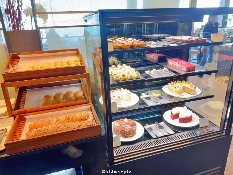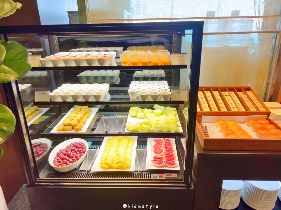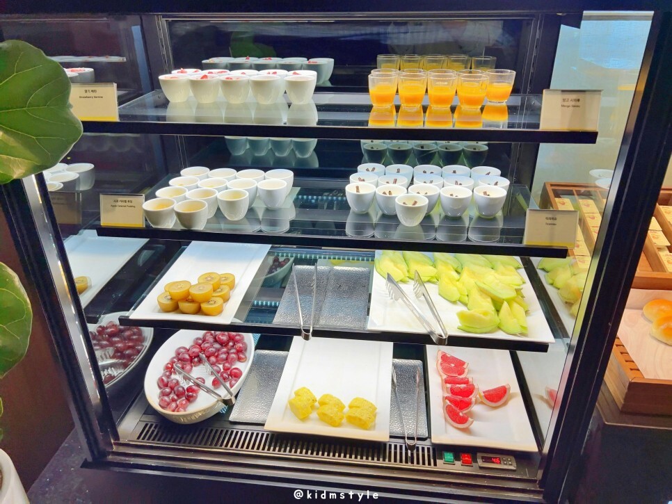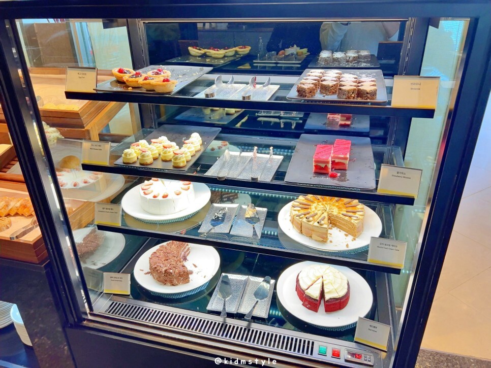 입구 쪽에는 과일, 쿠키, 케이크 등 디저트가 있습니다.