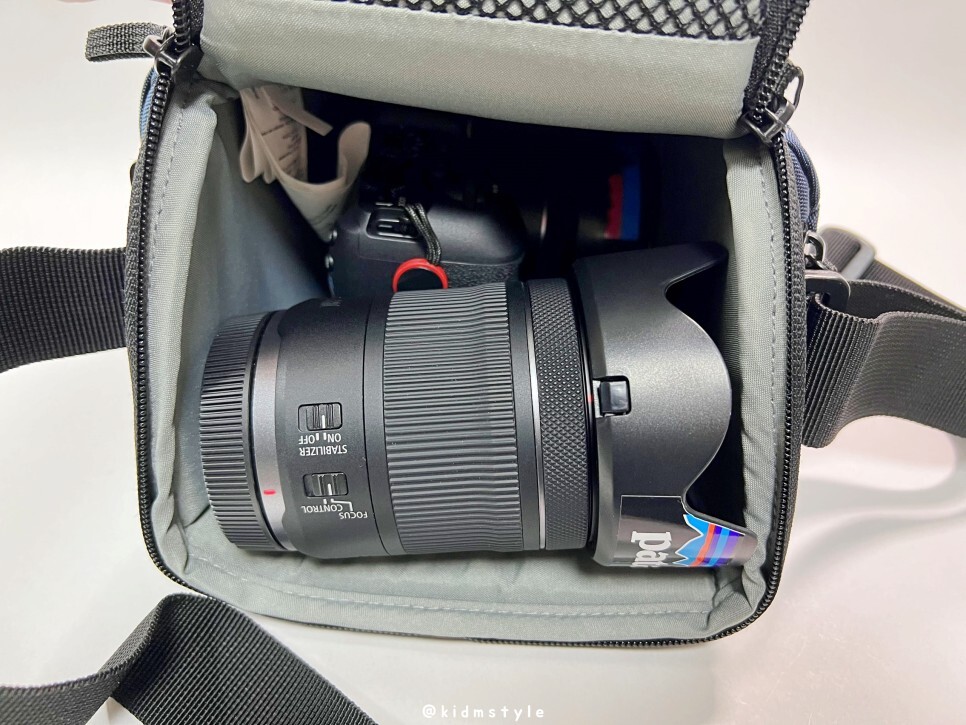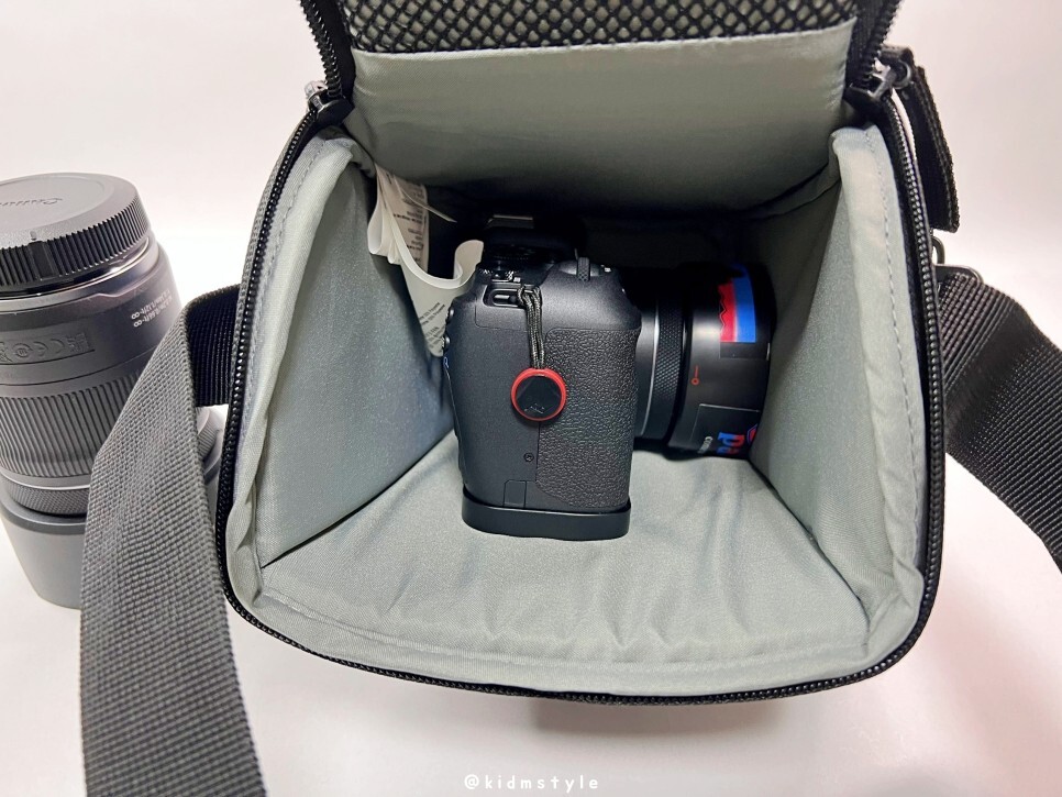 렌즈 후드를 장착한 24-105 F4-7.1 stm 줌렌즈를 마운트 한 canon RP 바디를 넣어봤습니다. 상단에 여유가 꽤 있습니다.