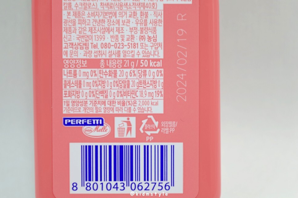 원산지는 중국이며 수입 판매는 농심에서 하네요. 퍼페티 반 멜레 중국 공장에서 생산했습니다. 이 회사는 이탈리아의 세계적인 제과 기업입니다.