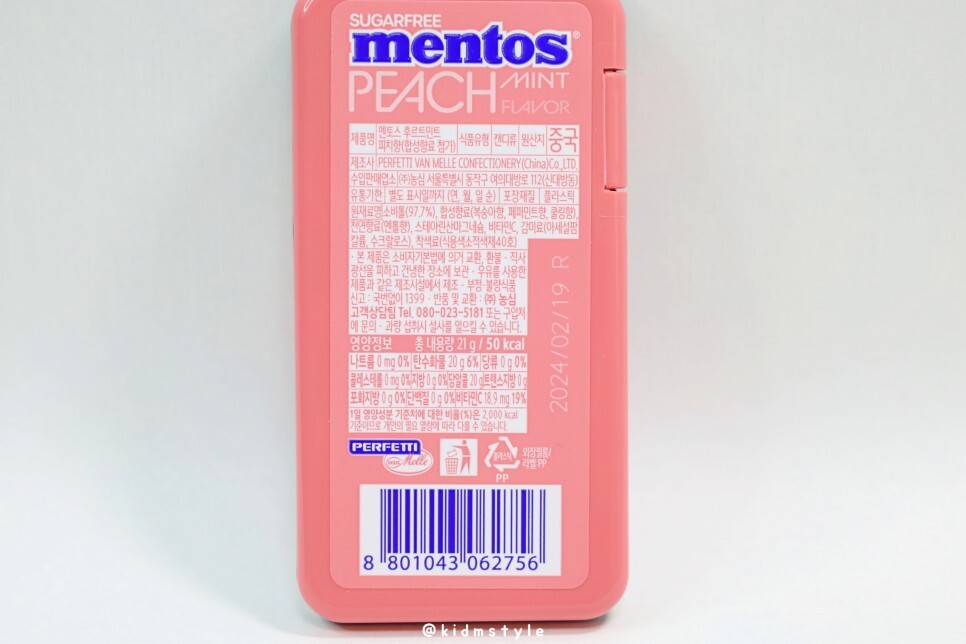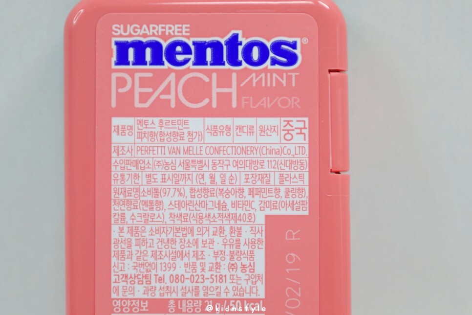 21g 50kcal에 복숭아향 합성향료, 페퍼민트향, 비타민 C의 구성입니다.