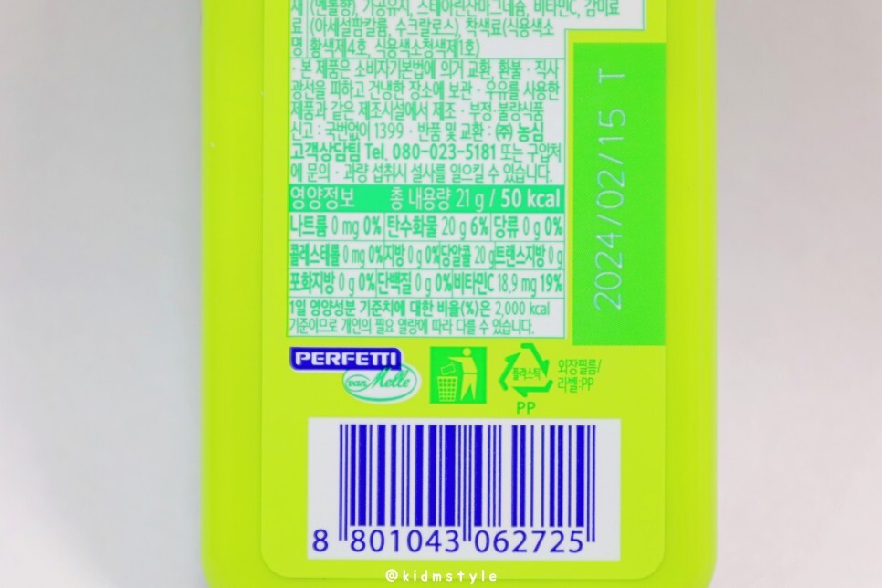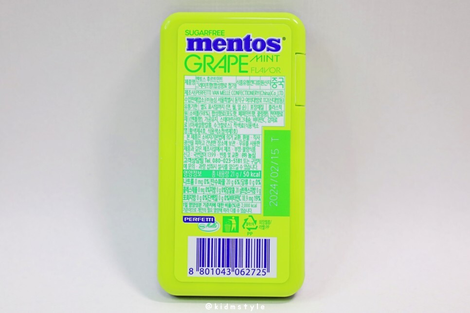 21g 50kcal이며 포도맛은 포도향, 페퍼민트향, 그리고 비타민 C가 0.14% 포함입니다.