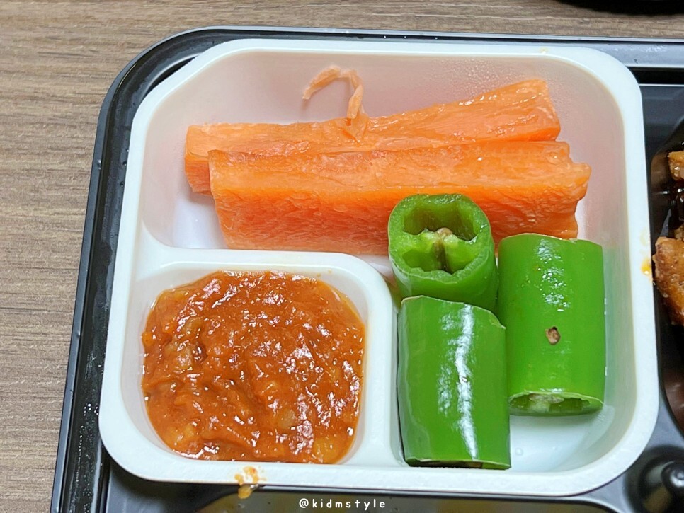 고추는 신선한 풋고추라 안 맵네요. 쌈장은 시판이고 당근 역시 신선하고 달달합니다.