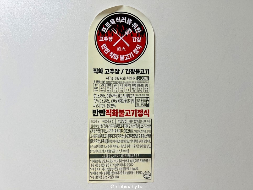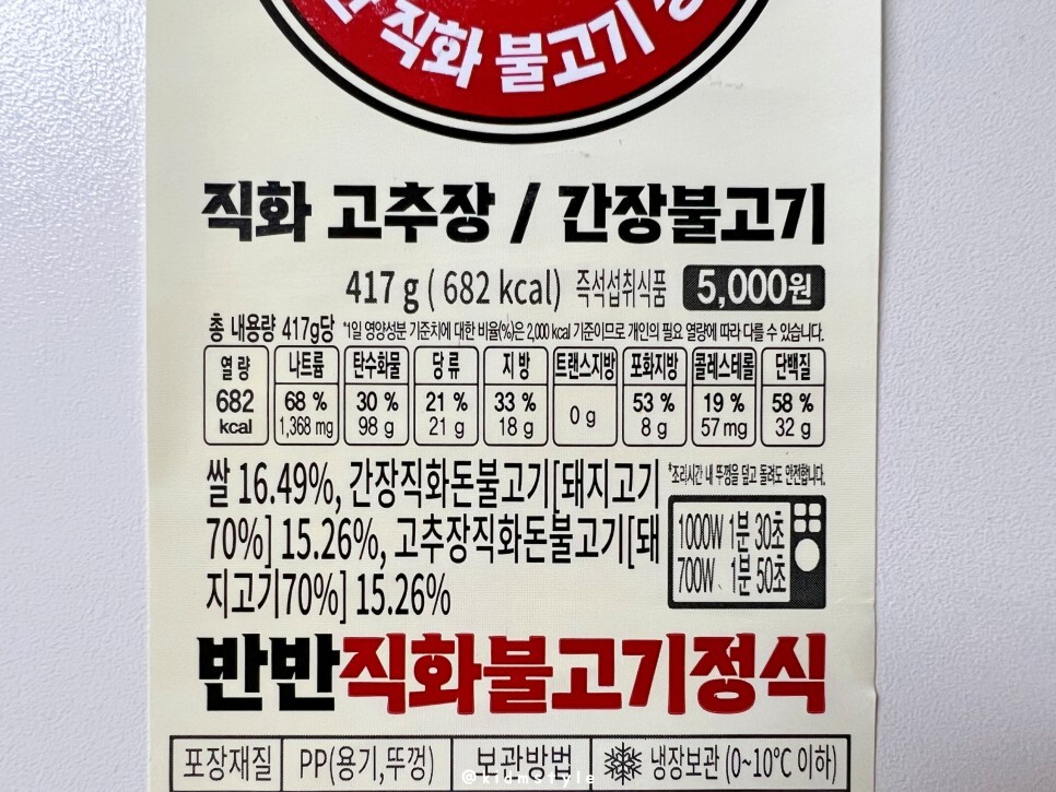 총 417g에 682kcal입니다. 영양성분 정보를 참고하시기 바랍니다. 전자레인지 가동시간은 업소용 1000w 1분 30초, 가정용 700w 기준 1분 50초를 돌리면 됩니다.
