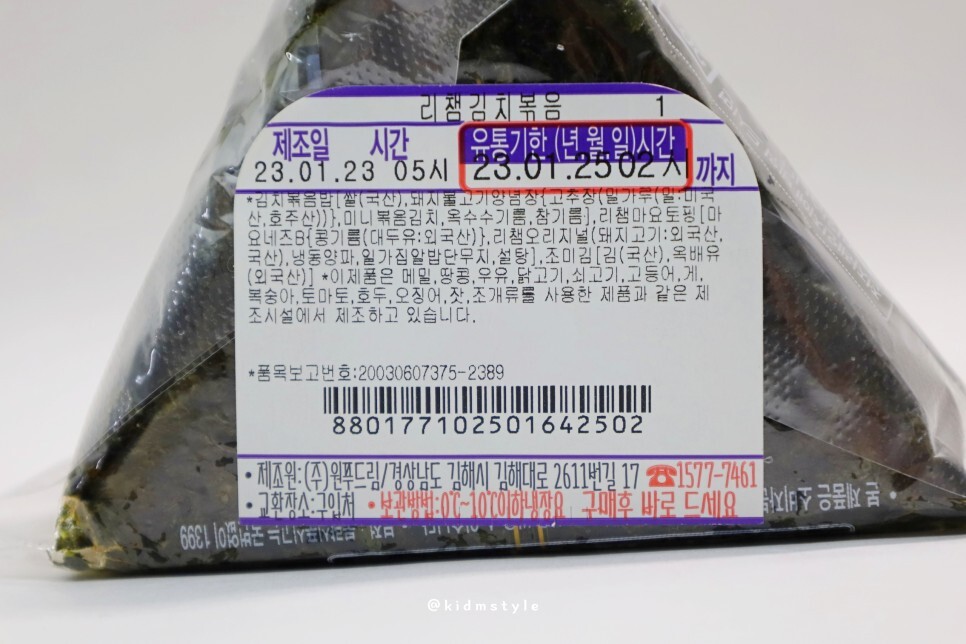 제조일부터 유통기한은 이틀 정도 여유가 있습니다. 어차피 기한이 지난 냉장 즉석식품은 판매 시 POS기에서 바코드가 안 찍히니 걱정 안 하셔도 됩니다. 보통 그 기한 전에 폐기 처리를 하기도 하고요. 원푸드림이라는 곳에서 제조했어요. 삼각김밥, 편의점 도시락 등을 제조하는 업체입니다.