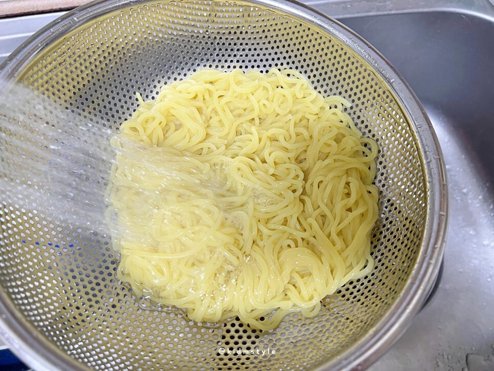 1. 물 1.4리터를 넣고 끓으면 중화면을 넣고 3분간 삶아서 찬물에 헹궈 체에 밭쳐줍니다.